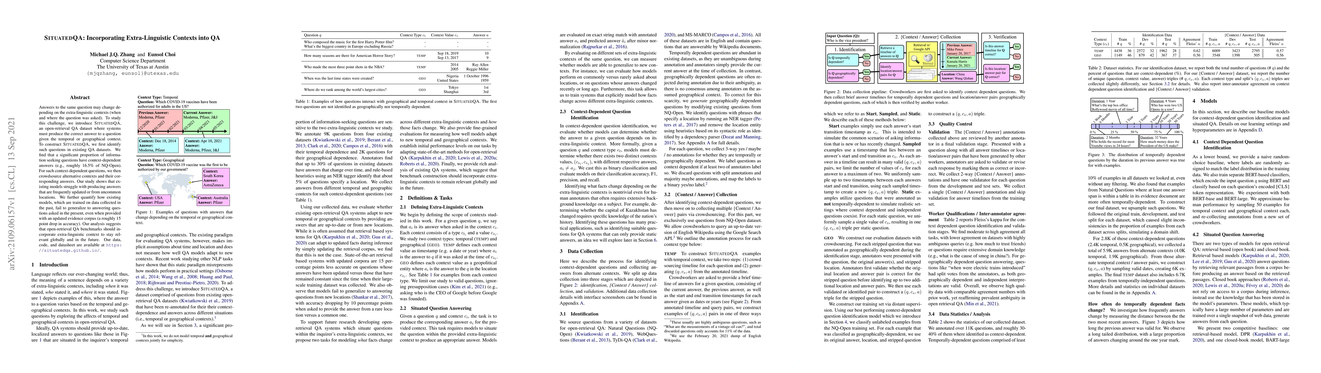 Answers to the same question may change depending on the extra-linguistic contexts (when and where the question was asked). To study this challenge, we introduce SituatedQA, an open-retrieval QA dataset where systems must produce the correct answer to a question given the temporal or geographical context. To construct SituatedQA, we first identify such questions in existing QA datasets. We find that a significant proportion of information seeking questions have context-dependent answers (e.g., roughly 16.5% of NQ-Open). For such context-dependent questions, we then crowdsource alternative contexts and their corresponding answers. Our study shows that existing models struggle with producing answers that are frequently updated or from uncommon locations. We further quantify how existing models, which are trained on data collected in the past, fail to generalize to answering questions asked in the present, even when provided with an updated evidence corpus (a roughly 15 point drop in accuracy). Our analysis suggests that open-retrieval QA benchmarks should incorporate extra-linguistic context to stay relevant globally and in the future. Our data, code, and datasheet are available at https://situatedqa.github.io/ .