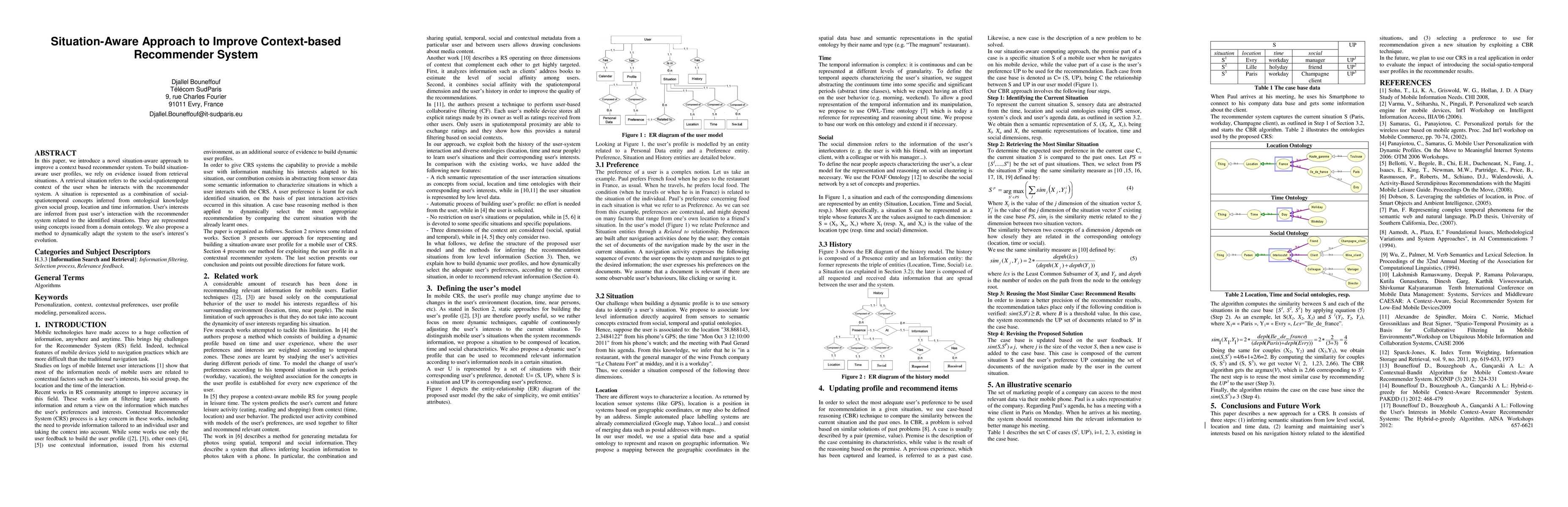 The research introduces a situation-aware approach for improving context-based recommender systems by inferring user's interests from past interactions related to identified social-spatiotemporal situations. It uses ontological knowledge for representing situations and a case-based reasoning method for dynamic adaptation to user interest evolution.