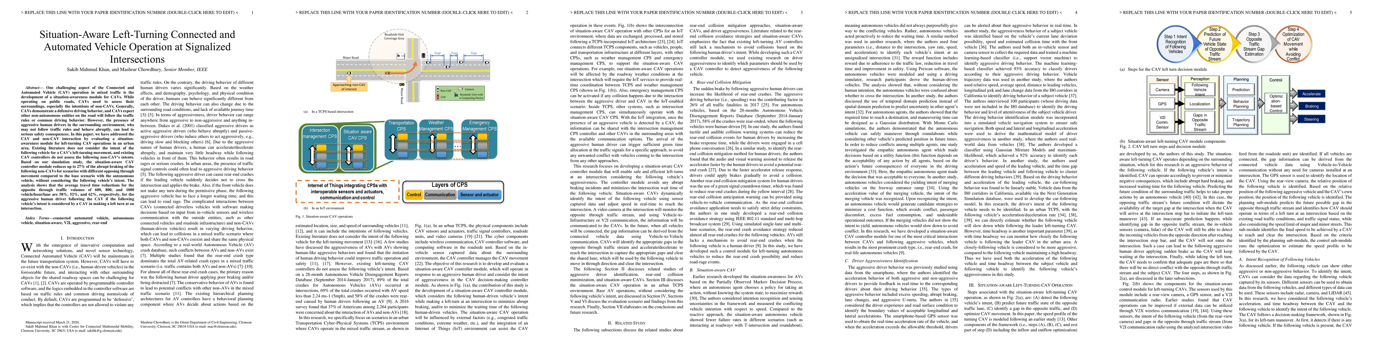 One challenging aspect of the Connected and Automated Vehicle (CAV) operation in mixed traffic is the development of a situation-awareness module for CAVs. While operating on public roads, CAVs need to assess their surroundings, especially the intentions of non-CAVs. Generally, CAVs demonstrate a defensive driving behavior, and CAVs expect other non-autonomous entities on the road will follow the traffic rules or common driving behavior. However, the presence of aggressive human drivers in the surrounding environment, who may not follow traffic rules and behave abruptly, can lead to serious safety consequences. In this paper, we have addressed the CAV and non-CAV interaction by evaluating a situation-awareness module for left-turning CAV operations in an urban area. Existing literature does not consider the intent of the following vehicle for a CAVs left-turning movement, and existing CAV controllers do not assess the following non-CAVs intents. Based on our simulation study, the situation-aware CAV controller module reduces up to 27% of the abrupt braking of the following non-CAVs for scenarios with different opposing through movement compared to the base scenario with the autonomous vehicle, without considering the following vehicles intent. The analysis shows that the average travel time reductions for the opposite through traffic volumes of 600, 800, and 1000 vehicle/hour/lane are 58%, 52%, and 62%, respectively, for the aggressive human driver following the CAV if the following vehicles intent is considered by a CAV in making a left turn at an intersection.