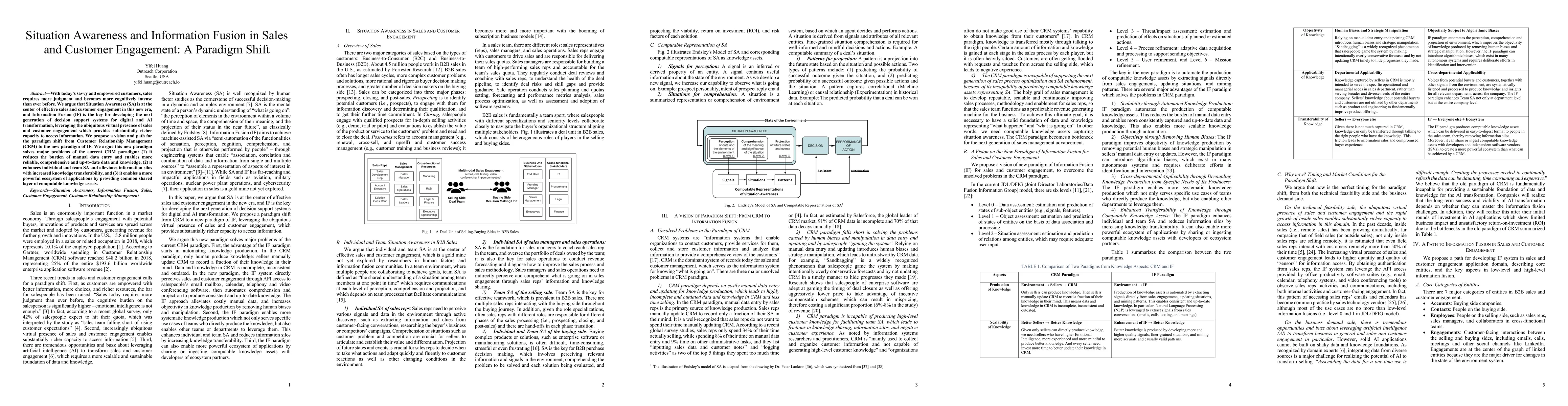 With today's savvy and empowered customers, sales requires more judgment and becomes more cognitively intense than ever before. We argue that Situation Awareness (SA) is at the center of effective sales and customer engagement in this new era, and Information Fusion (IF) is the key for developing the next generation of decision support systems for digital and AI transformation, leveraging the ubiquitous virtual presence of sales and customer engagement which provides substantially richer capacity to access information. We propose a vision and path for the paradigm shift from Customer Relationship Management (CRM) to the new paradigm of IF. We argue this new paradigm solves major problems of the current CRM paradigm: (1) it reduces the burden of manual data entry and enables more reliable, comprehensive and up-to-date data and knowledge, (2) it enhances individual and team SA and alleviates information silos with increased knowledge transferability, and (3) it enables a more powerful ecosystem of applications by providing common shared layer of computable knowledge assets.