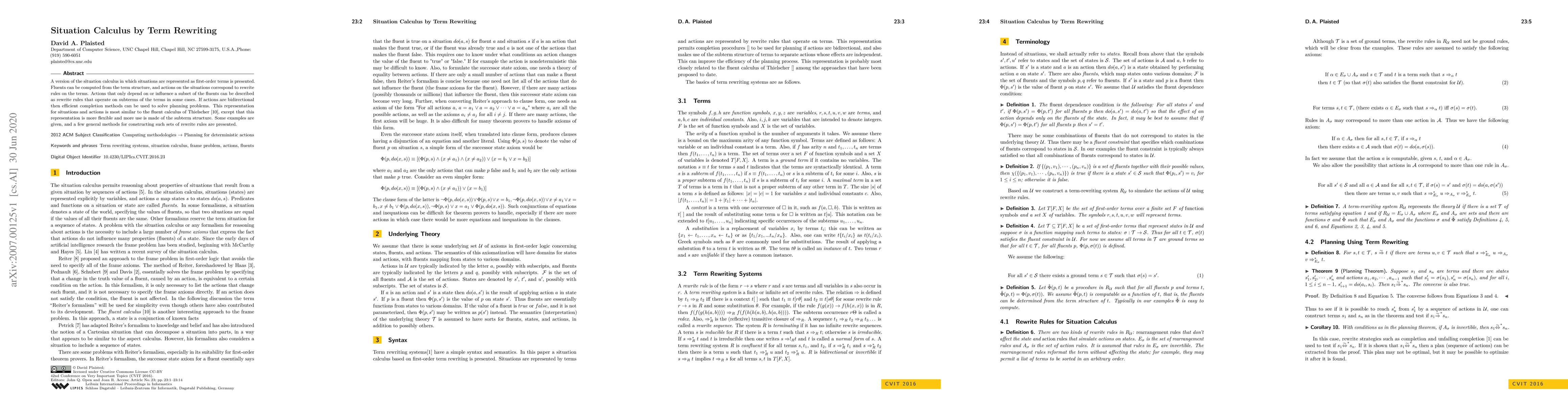A new approach to situation calculus is presented, where situations are represented as first-order terms that can be rewritten using rewrite rules based on actions, enabling efficient planning problems solution.