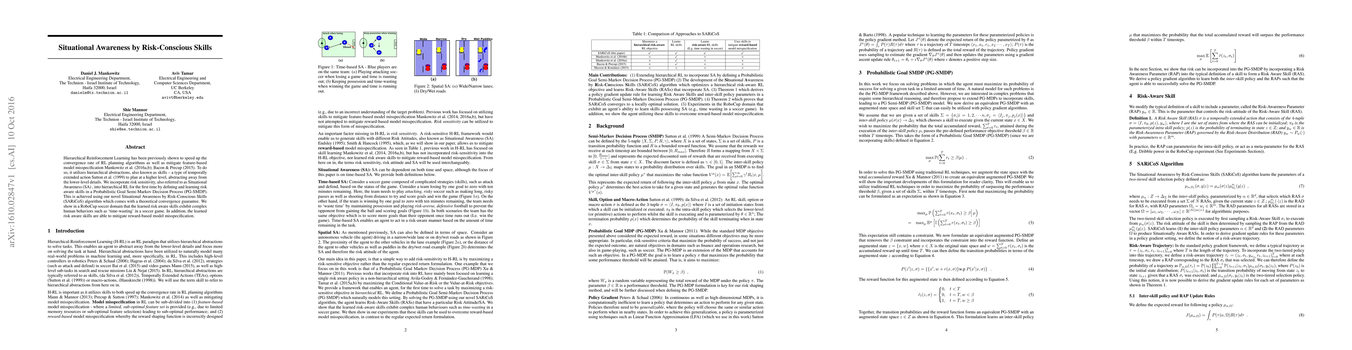 Hierarchical Reinforcement Learning has been previously shown to speed up the convergence rate of RL planning algorithms as well as mitigate feature-based model misspecification (Mankowitz et. al. 2016a,b, Bacon 2015). To do so, it utilizes hierarchical abstractions, also known as skills -- a type of temporally extended action (Sutton et. al. 1999) to plan at a higher level, abstracting away from the lower-level details. We incorporate risk sensitivity, also referred to as Situational Awareness (SA), into hierarchical RL for the first time by defining and learning risk aware skills in a Probabilistic Goal Semi-Markov Decision Process (PG-SMDP). This is achieved using our novel Situational Awareness by Risk-Conscious Skills (SARiCoS) algorithm which comes with a theoretical convergence guarantee. We show in a RoboCup soccer domain that the learned risk aware skills exhibit complex human behaviors such as `time-wasting' in a soccer game. In addition, the learned risk aware skills are able to mitigate reward-based model misspecification.
