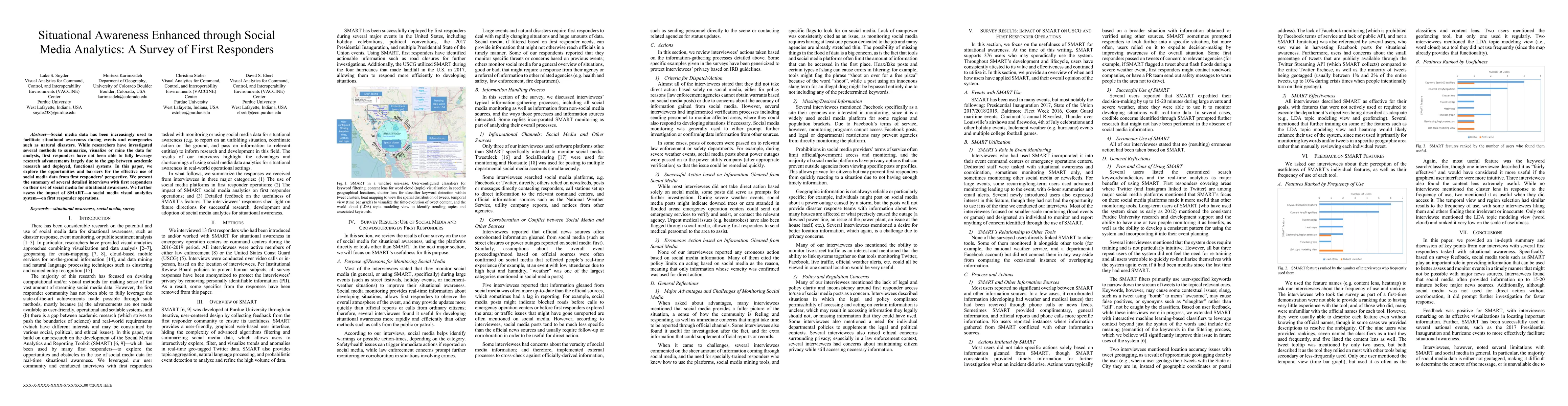 This paper investigates how social media analytics can enhance situational awareness for first responders during emergencies, highlighting the gap between research and practical application. It summarizes interviews with first responders and evaluates the effectiveness of SMART, a social media visual analytics system, in improving operational insights.