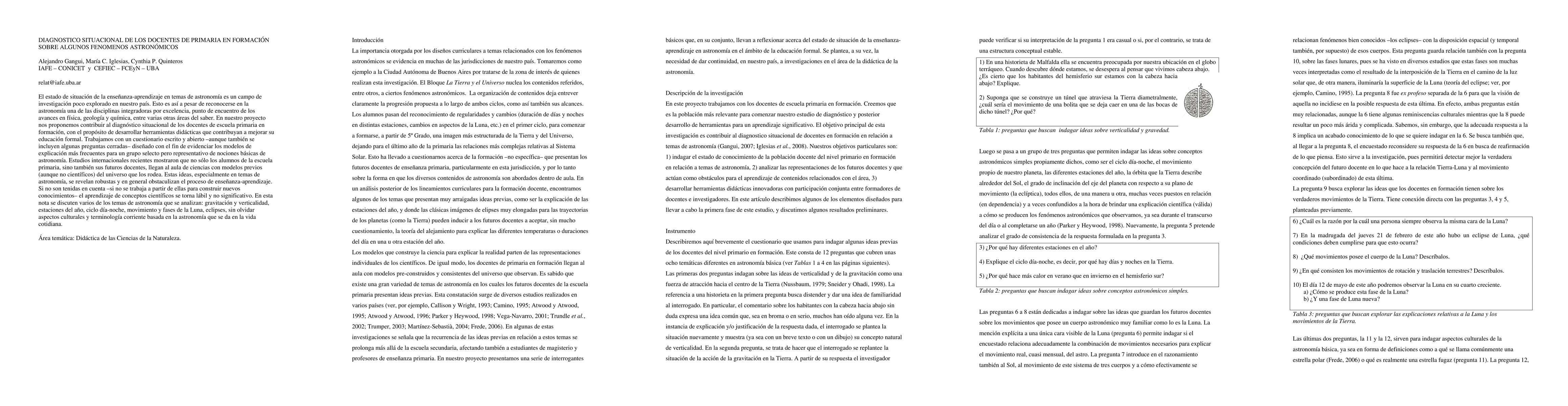 The present situation of the teaching-learning relationship in astronomy is rarely investigated in our country. This is so, even when it is widely recognized that astronomy is an integral discipline, at the crossroads of advances in physics, geology, chemistry, etc. In this project we aim at contributing with the situational diagnosis in topics of astronomy of preservice elementary teachers, and to try and develop didactic tools that better collaborate with their formal education. We work with an open written questionnaire, designed to put in evidence some of the most frequently used models on a few basic astronomical notions. We here describe the main questions included in the test, and show our first results and some conclusions after having addressed the questionnaire to a number of preservice elementary teachers.