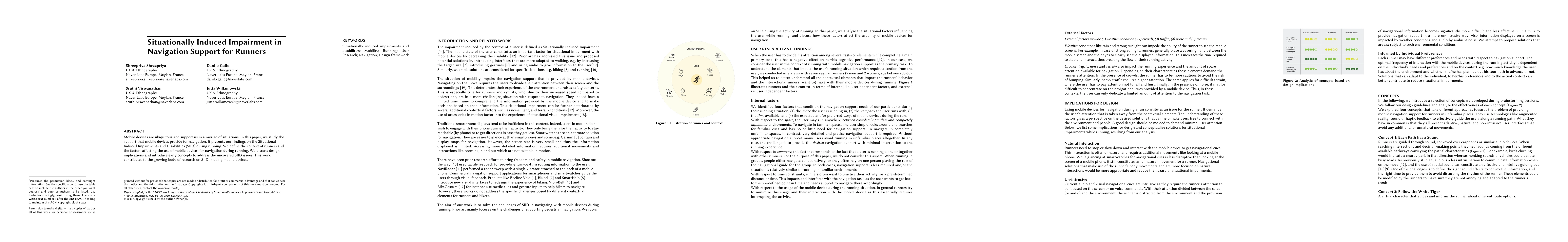 Mobile devices are ubiquitous and support us in a myriad of situations. In this paper, we study the support that mobile devices provide for navigation. It presents our findings on the Situational Induced Impairments and Disabilities (SIID) during running. We define the context of runners and the factors affecting the use of mobile devices for navigation during running. We discuss design implications and introduce early concepts to address the uncovered SIID issues. This work contributes to the growing body of research on SIID in using mobile devices.