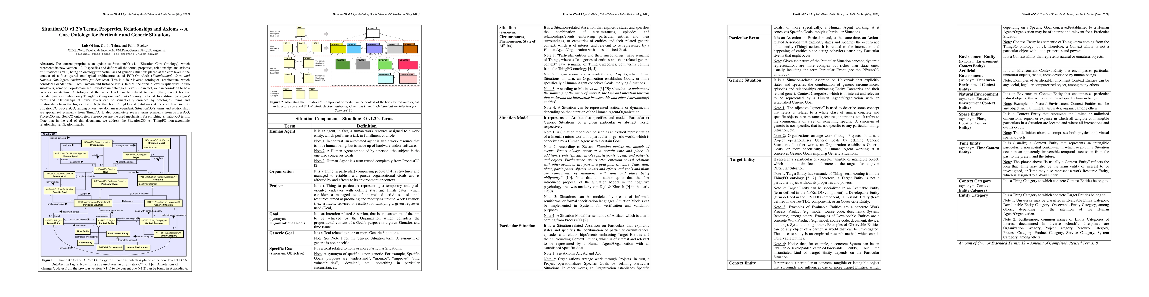The current preprint is an update to SituationCO v1.1 (Situation Core Ontology), which represents its new version 1.2. It specifies and defines all the terms, properties, relationships and axioms of SituationCO v1.2, being an ontology for particular and generic Situations placed at the core level in the context of a four-layered ontological architecture called FCD-OntoArch (Foundational, Core, and Domain Ontological Architecture for Sciences). This is a four-layered ontological architecture, which considers Foundational, Core, Domain and Instance levels. In turn, the domain level is split down in two sub-levels, namely: Top-domain and Low-domain ontological levels. So in fact, we can consider it to be a five-tier architecture. Ontologies at the same level can be related to each other, except for the foundational level where only ThingFO (Thing Foundational Ontology) is found. In addition, ontologies' terms and relationships at lower levels can be semantically enriched by ontologies' terms and relationships from the higher levels. Note that both ThingFO and ontologies at the core level such as SituationCO, ProcessCO, among others, are domain independent. SituationCO's terms and relationships are specialized primarily from ThingFO. It also completely reuses terms primarily from ProcessCO, ProjectCO and GoalCO ontologies. Stereotypes are the used mechanism for enriching SituationCO terms. Note that in the end of this document, we address the SituationCO vs. ThingFO non-taxonomic relationship verification matrix.