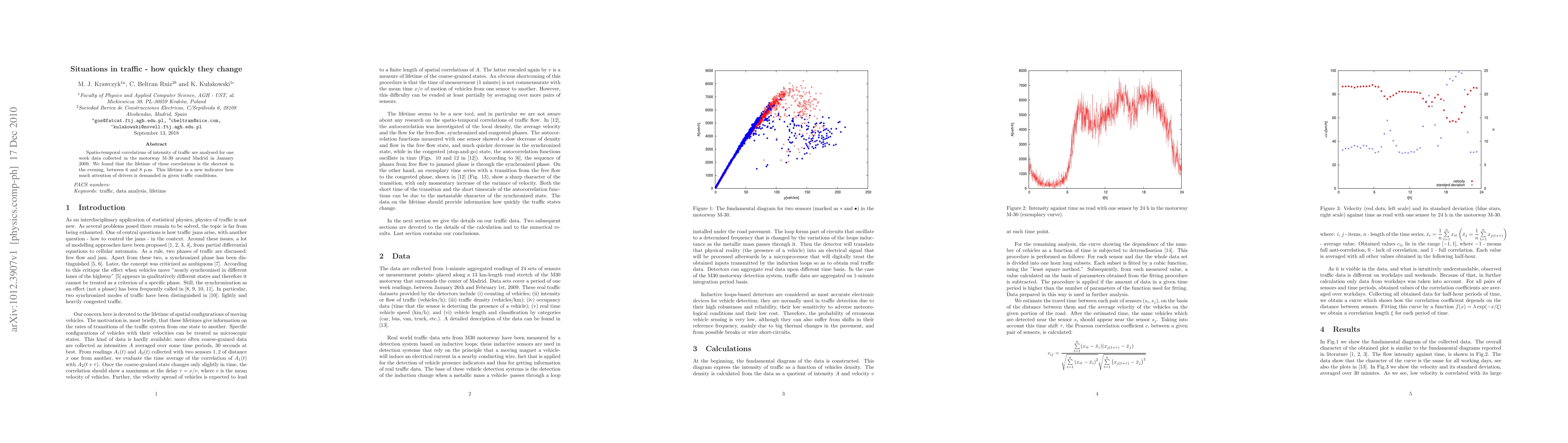Spatio-temporal correlations of intensity of traffic are analysed for one week data collected in the motorway M-30 around Madrid in January 2009. We found that the lifetime of these correlations is the shortest in the evening, between 6 and 8 p.m. This lifetime is a new indicator how much attention of drivers is demanded in given traffic conditions.