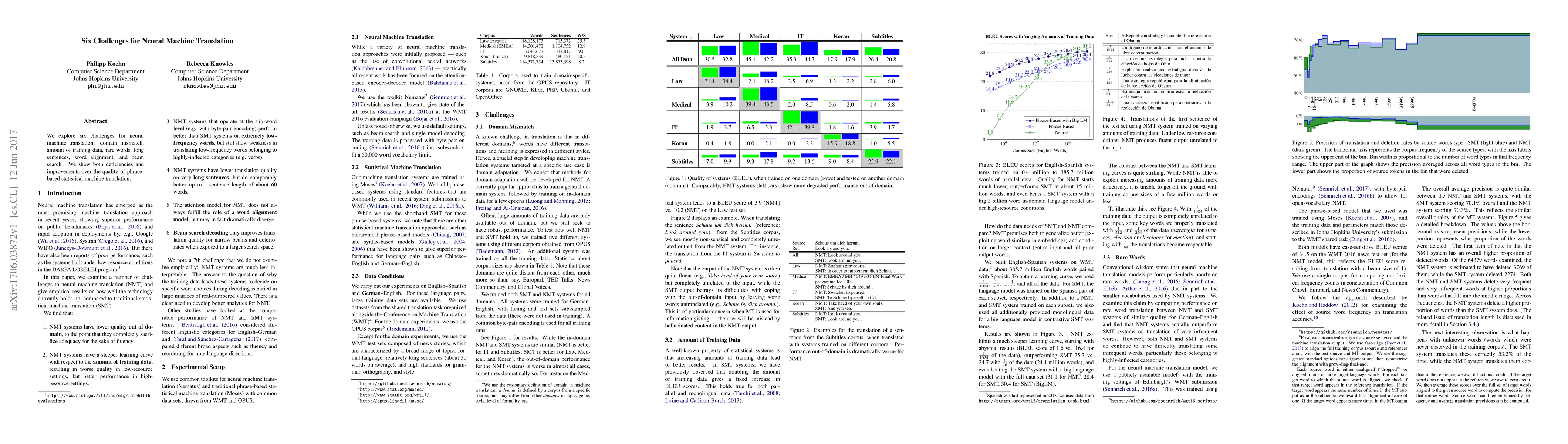 This paper identifies six key challenges in neural machine translation: domain mismatch, limited training data, rare words, long sentences, word alignment, and beam search. It compares these issues to improvements over phrase-based statistical machine translation, highlighting both deficiencies and advancements.