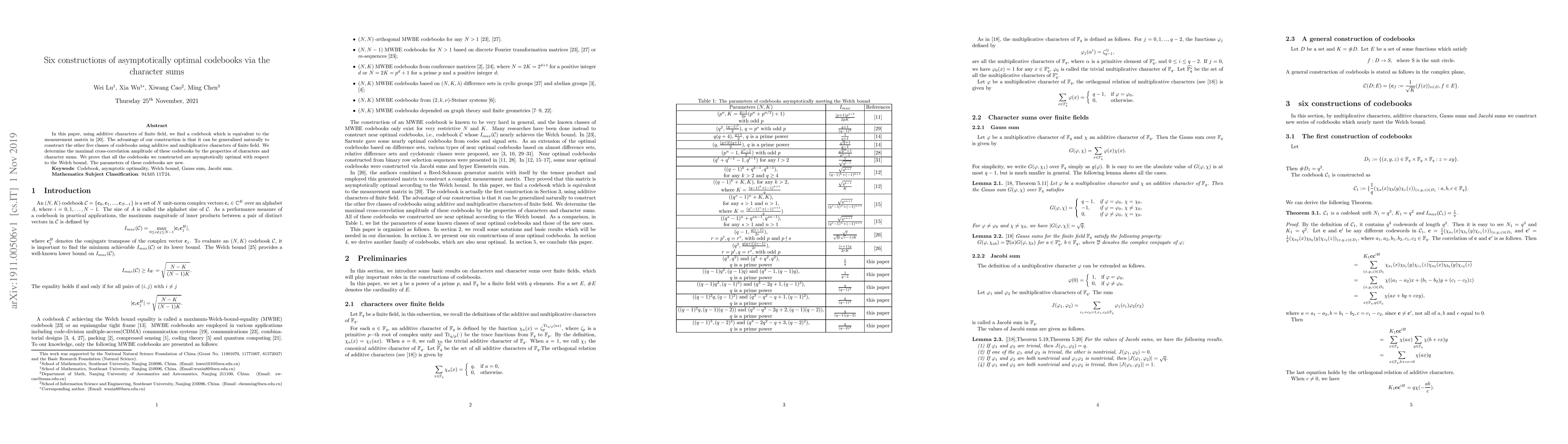 In this paper, using additive characters of finite field, we find a codebook which is equivalent to the measurement matrix in [20]. The advantage of our construction is that it can be generalized naturally to construct the other five classes of codebooks using additive and multiplicative characters of finite field. We determine the maximal cross-correlation amplitude of these codebooks by the properties of characters and character sums. We prove that all the codebooks we constructed are asymptotically optimal with respect to the Welch bound. The parameters of these codebooks are new.