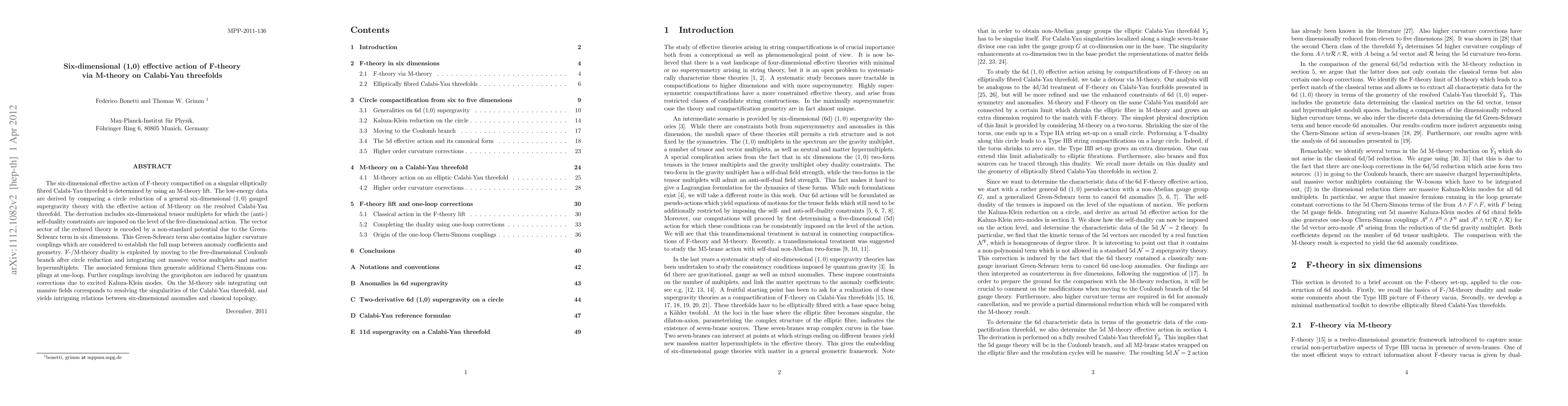 This paper determines the six-dimensional effective action of F-theory compactified on Calabi-Yau threefolds using M-theory, deriving low-energy data through circle reduction of a six-dimensional (1,0) gauged supergravity theory and comparing it with M-theory on resolved Calabi-Yau threefolds. It explores F-/M-theory duality and the implications of Green-Schwarz mechanisms, higher curvature couplings, and quantum corrections on the vector sector and the generation of Chern-Simons couplings.