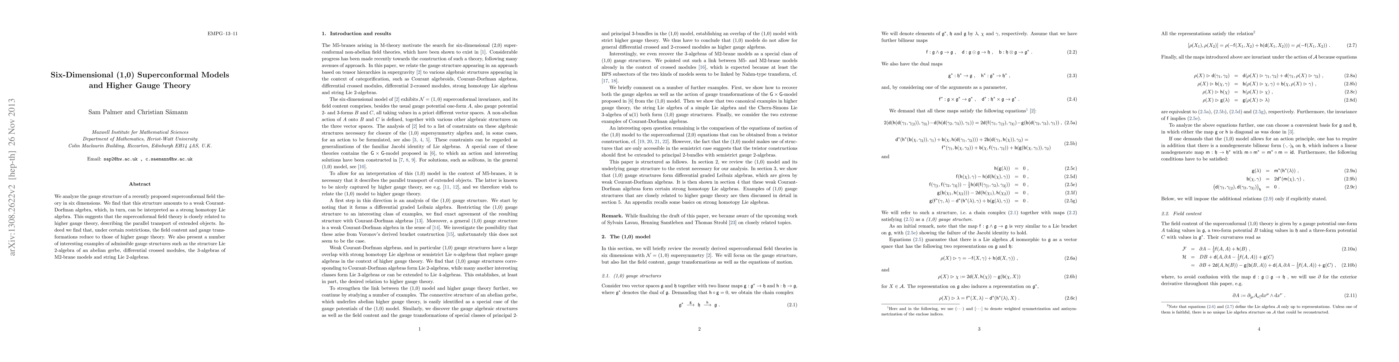 This paper explores the gauge structure of six-dimensional (1,0) superconformal field theories, revealing a weak Courant-Dorfman algebra that aligns with higher gauge theory. It demonstrates the theory's connection to the parallel transport of extended objects and presents examples of relevant gauge structures.