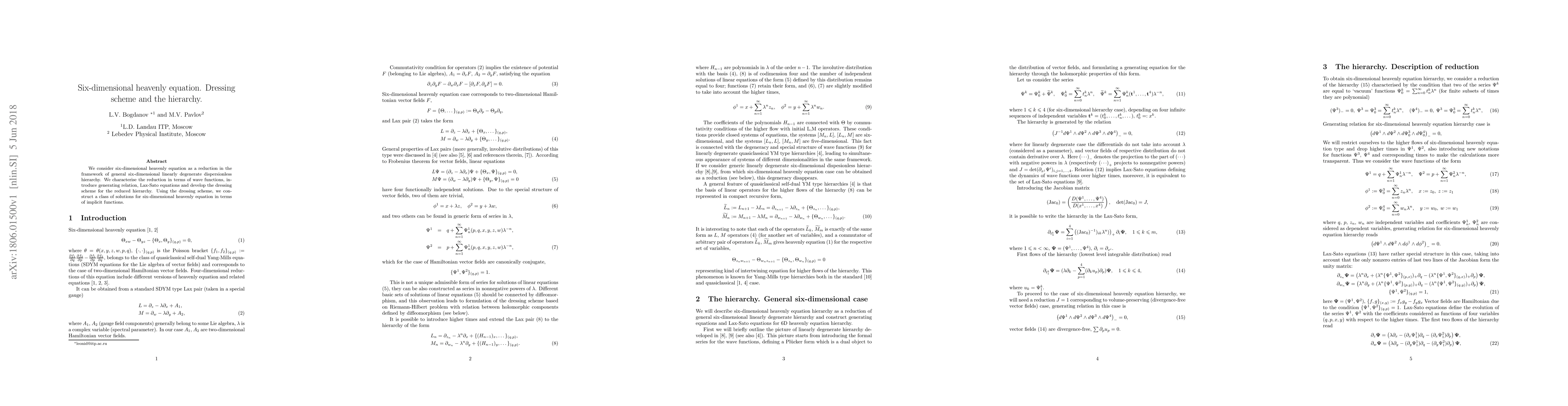This paper explores the six-dimensional heavenly equation as a reduction within a general six-dimensional linearly degenerate dispersionless hierarchy, developing a dressing scheme and constructing implicit solutions using generating relations and Lax-Sato equations.