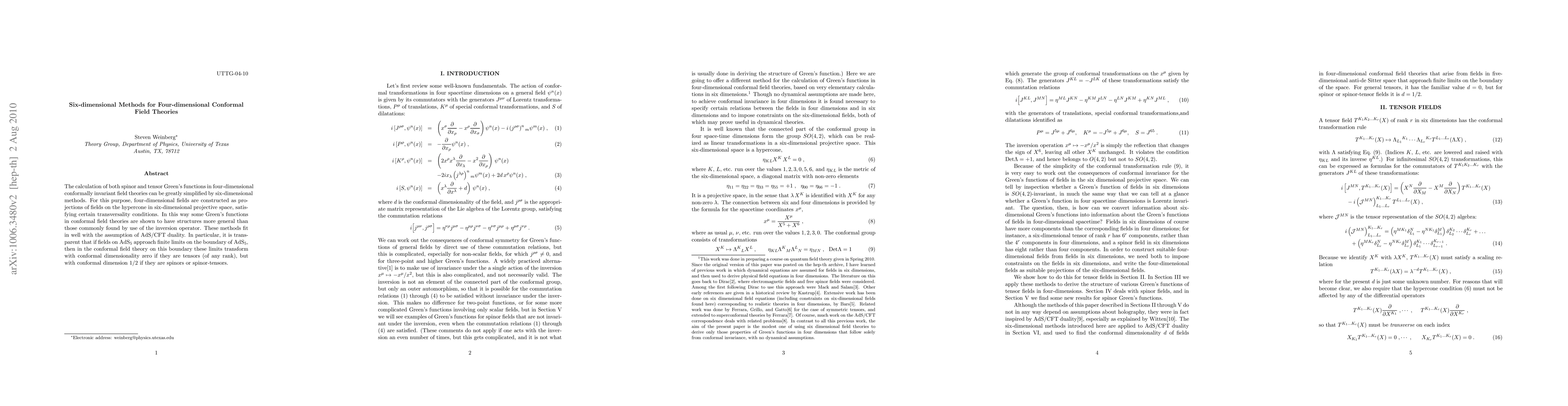 This paper proposes six-dimensional methods to simplify calculations of Green's functions in four-dimensional conformal field theories, constructing four-dimensional fields as projections from six-dimensional projective space, and aligns these methods with AdS/CFT duality, revealing distinct conformal dimensions for tensors and spinors on the boundary.