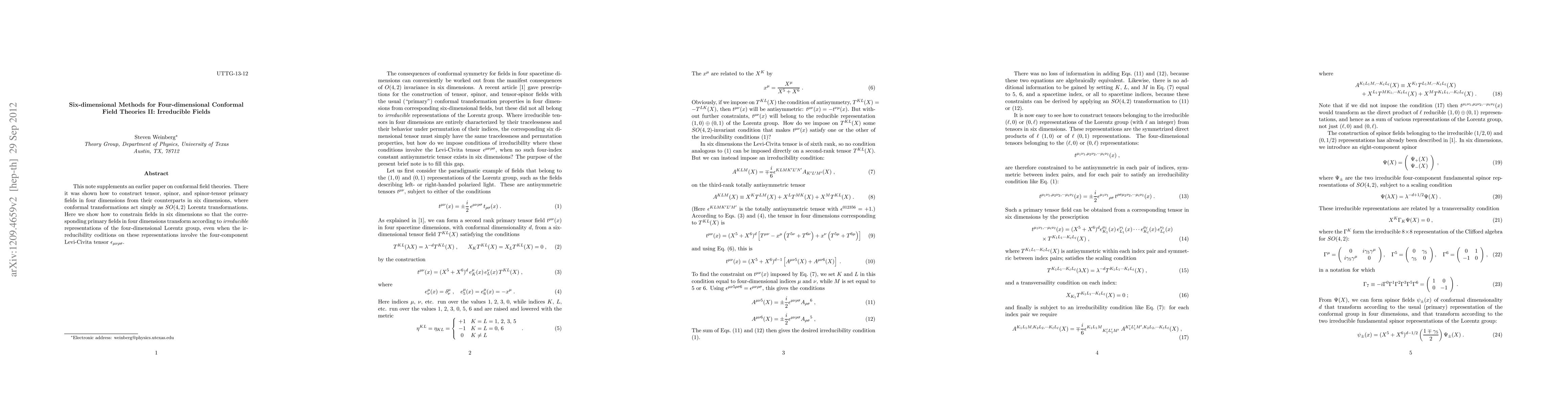 This note supplements an earlier paper on conformal field theories. There it was shown how to construct tensor, spinor, and spinor-tensor primary fields in four dimensions from their counterparts in six dimensions, where conformal transformations act simply as SO(4,2) Lorentz transformations. Here we show how to constrain fields in six dimensions so that the corresponding primary fields in four dimensions transform according to irreducible representations of the four-dimensional Lorentz group, even when the irreducibility conditions on these representations involve the four-component Levi-Civita tensor $\epsilon_{\mu\nu\rho\sigma}$.