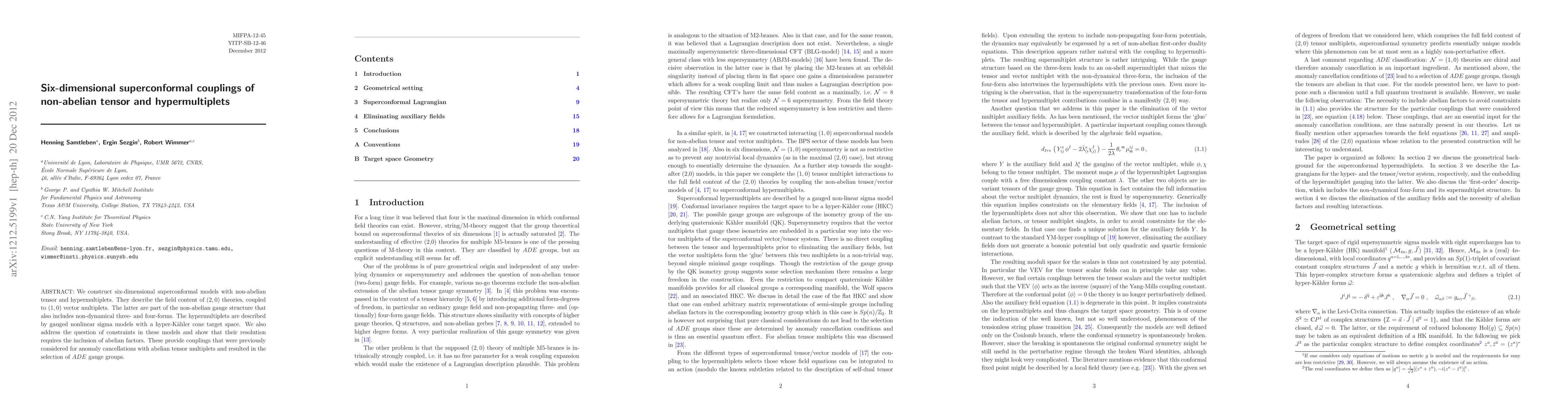 This research constructs six-dimensional superconformal models involving non-abelian tensor and hypermultiplets, characterizing (2,0) theories coupled with (1,0) vector multiplets. It reveals the necessity of including abelian factors to resolve constraints and highlights their role in previously studied anomaly cancellations linked to ADE gauge groups.