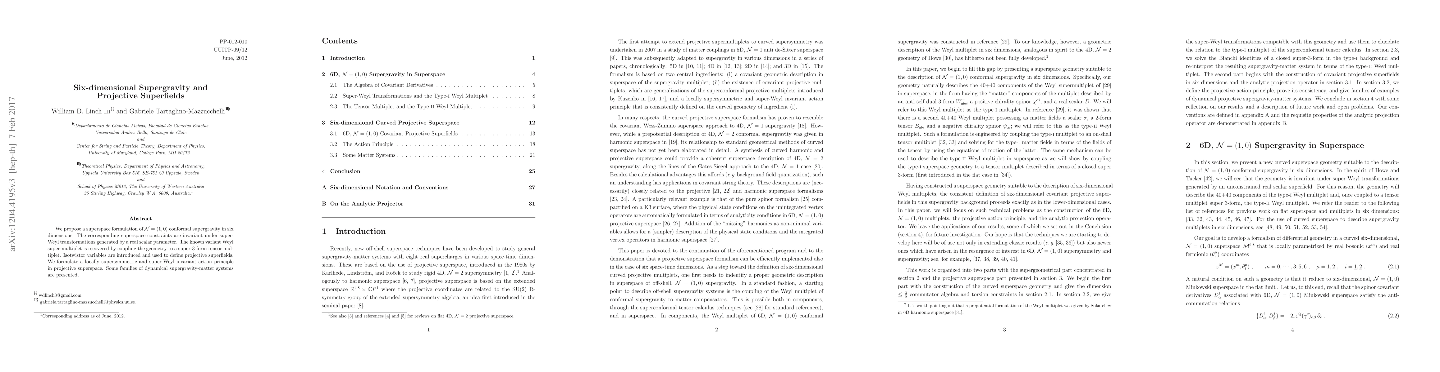 This paper proposes a superspace formulation for N=(1,0) conformal supergravity in six dimensions, introducing projective superfields and a super-Weyl invariant action principle, while coupling the geometry to a super-3-form tensor multiplet to recover the known Weyl super-multiplet.