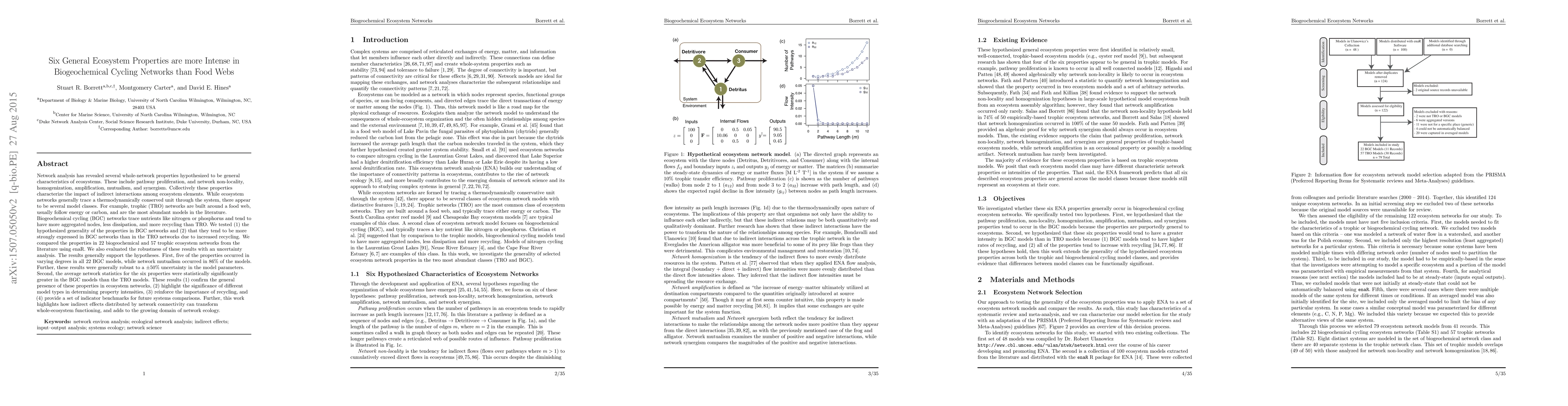 This study confirms that six general ecosystem properties—pathway proliferation, non-locality, homogenization, amplification, mutualism, and synergism—are more intense in biogeochemical cycling networks compared to trophic networks, primarily due to increased recycling. The findings underscore the significance of network type in ecosystem functioning and provide benchmarks for future ecological network comparisons.