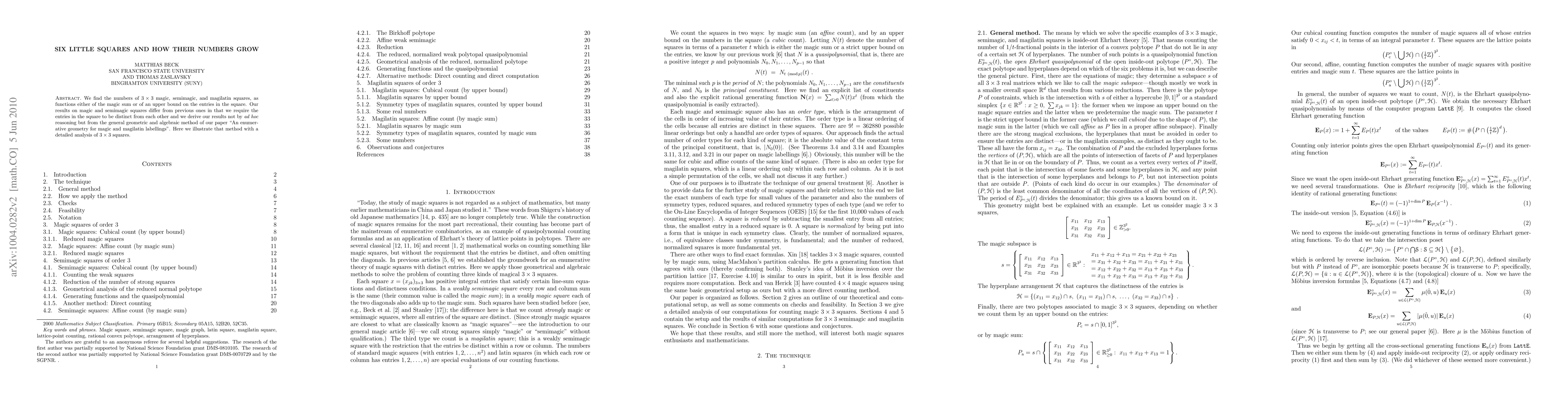 We find the numbers of $3 \times 3$ magic, semimagic, and magilatin squares, as functions either of the magic sum or of an upper bound on the entries in the square. Our results on magic and semimagic squares differ from previous ones in that we require the entries in the square to be distinct from each other and we derive our results not by \emph{ad hoc} reasoning but from the general geometric and algebraic method of our paper "An enumerative geometry for magic and magilatin labellings". Here we illustrate that method with a detailed analysis of $3\times3$ squares.