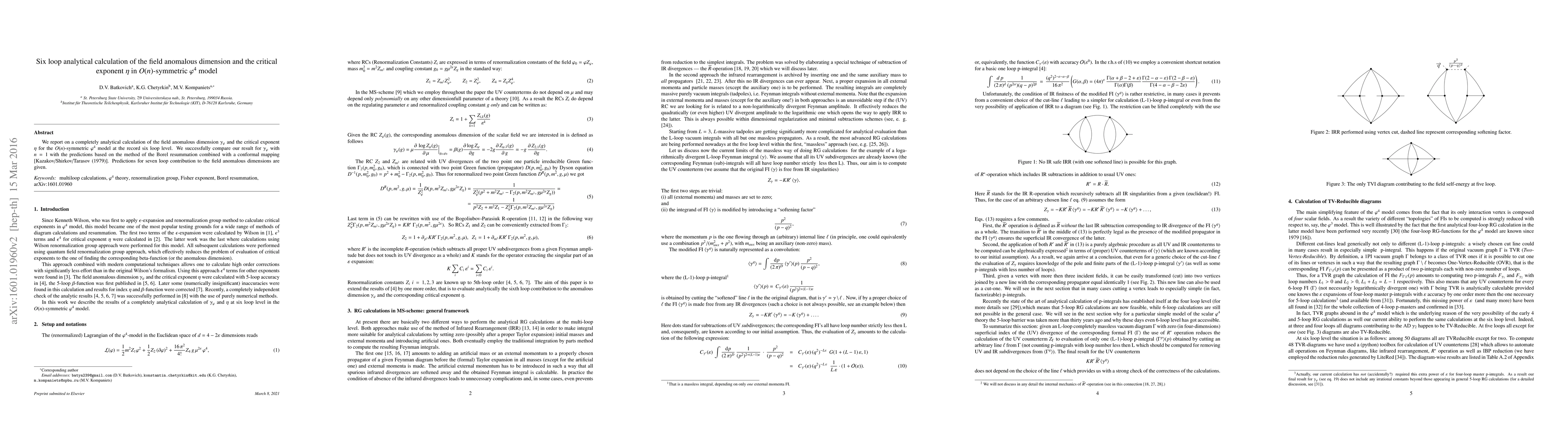 We report on a completely analytical calculation of the field anomalous dimension $\gamma_{\varphi}$ and the critical exponent $\eta$ for the $O(n)$-symmetric $\varphi^4$ model at the record six loop level. We successfully compare our result for $\gamma_{\varphi}$ with $n=1$ with the predictions based on the method of the Borel resummation combined with a conformal mapping. Predictions for seven loop contribution to the field anomalous dimensions are given.