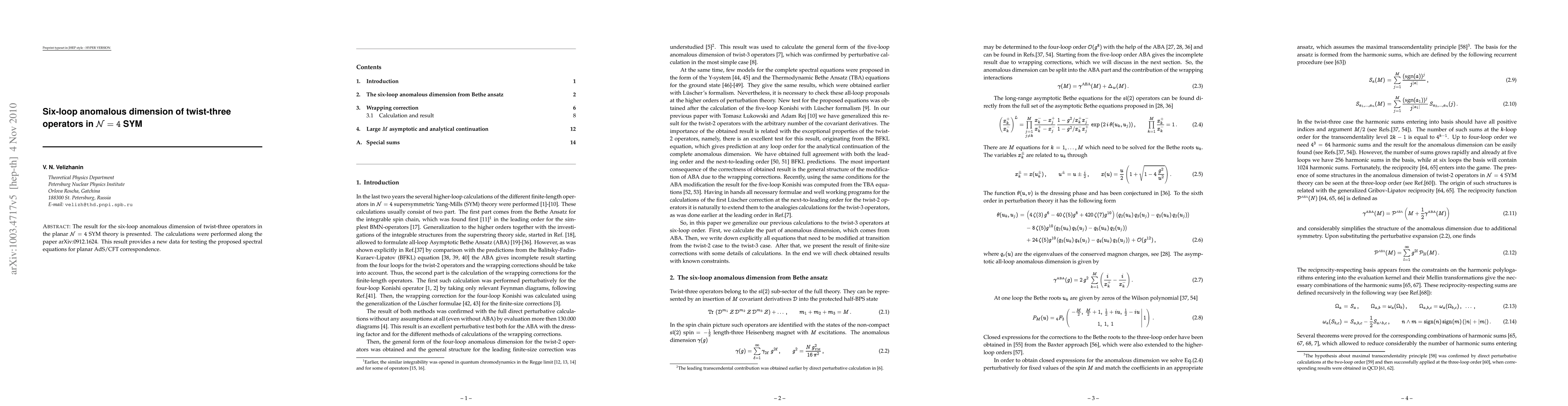 This paper presents the six-loop anomalous dimension of twist-three operators in N=4 SYM theory, providing new data for testing the spectral equations in the context of the planar AdS/CFT correspondence. The calculations follow the methodology outlined in arXiv:0912.1624.
