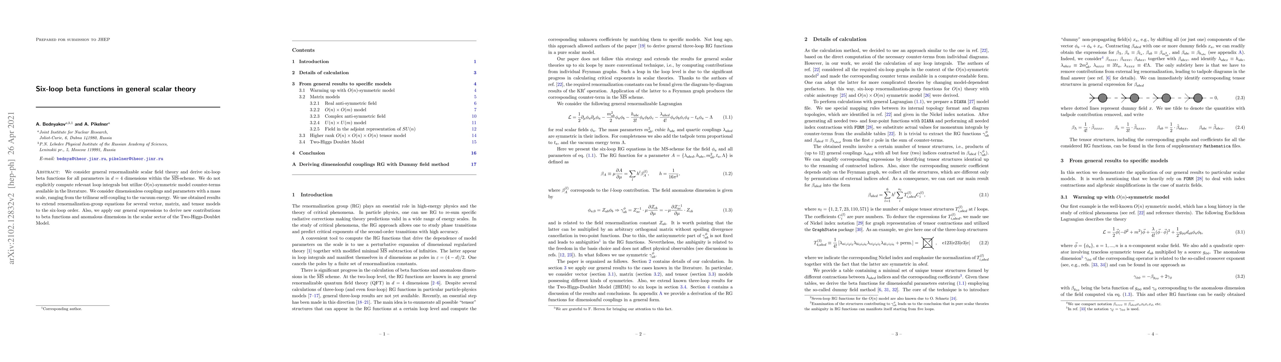 This paper derives six-loop beta functions for all parameters in general scalar field theory in 4 dimensions using $O(n)$-symmetric model counter-terms, extending renormalization-group equations to six-loop order and applying the results to the Two-Higgs-Doublet Model. The focus is on dimensionless couplings without explicitly computing loop integrals.