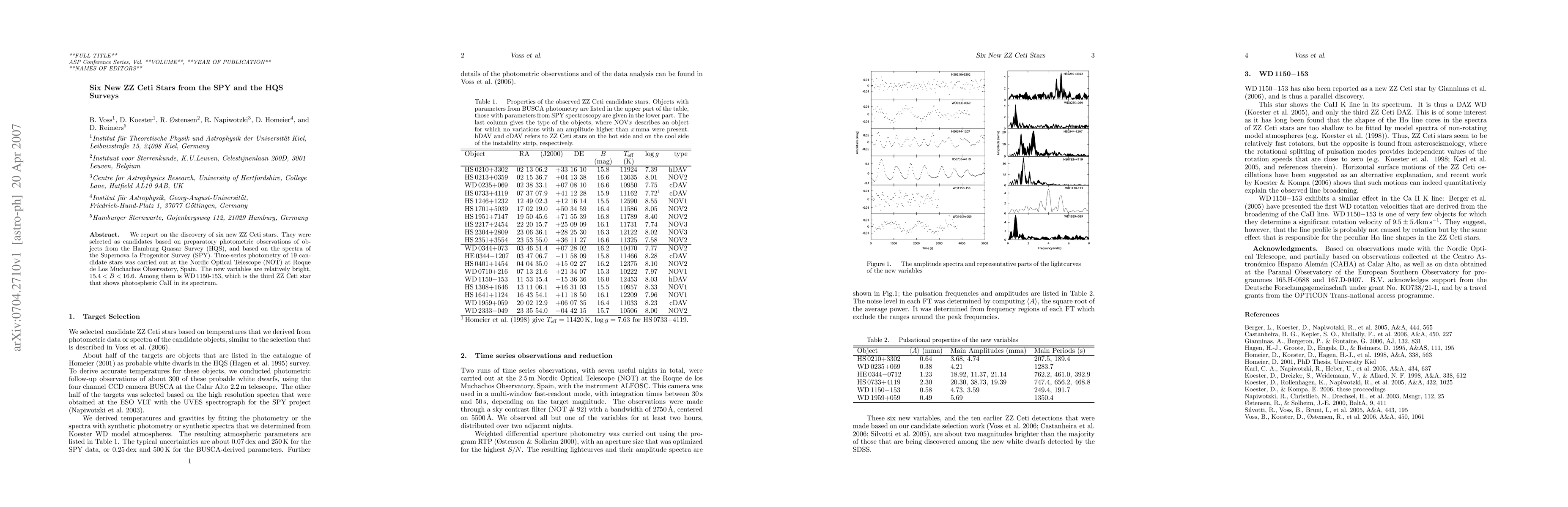This paper reports the discovery of six new ZZ Ceti stars identified through photometric observations and spectra from the HQS and SPY surveys. These relatively bright stars, with B magnitudes ranging from 15.4 to 16.6, were confirmed using time-series photometry at the Nordic Optical Telescope in Spain, with WD1150-153 noted for its unique photospheric CaII spectrum.