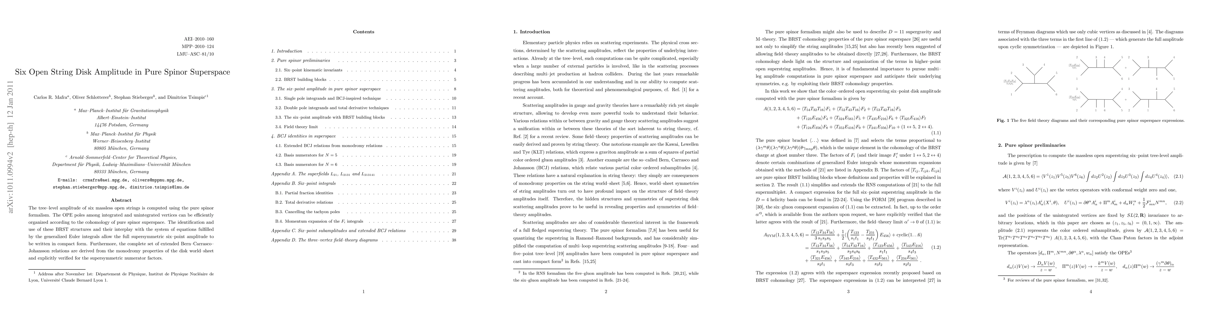 This paper computes the tree-level six-point open string disk amplitude using pure spinor superspace, organizing OPE poles via cohomology and deriving compact supersymmetric expressions. It also verifies the extended Bern-Carrasco-Johansson relations through the disk's monodromy properties.