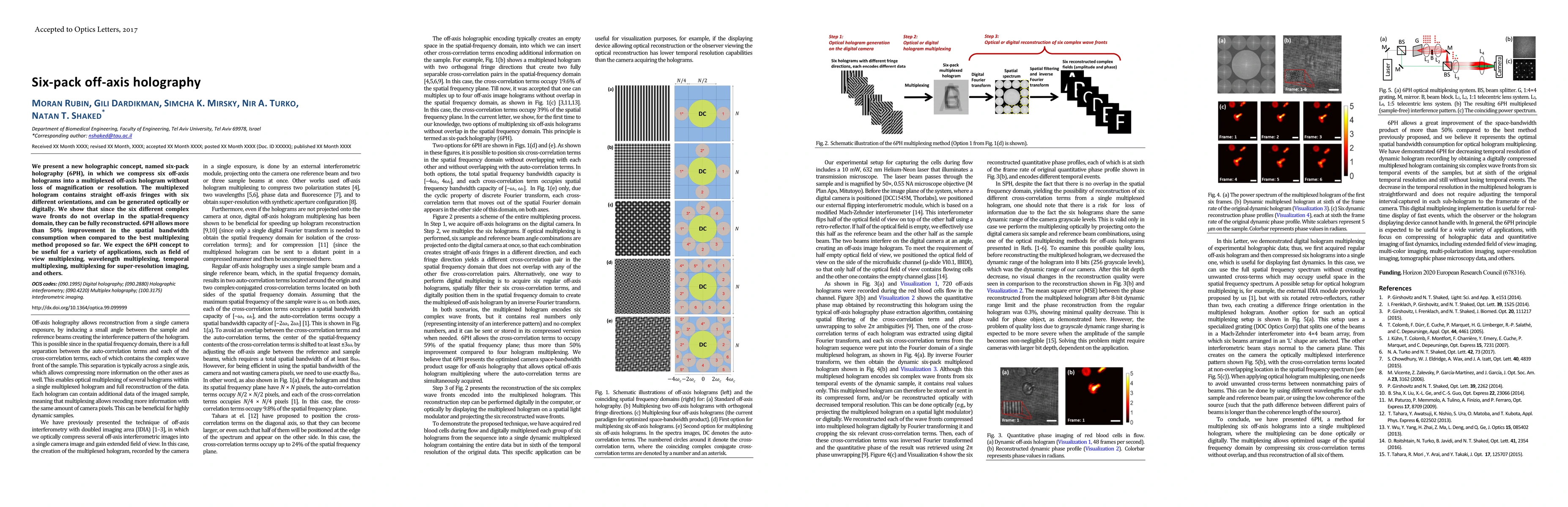 The paper introduces six-pack holography (6PH), a novel method to compress six off-axis holograms into a single hologram without loss of resolution, offering over 50% improvement in spatial bandwidth efficiency. This technique can be applied to various multiplexing applications, enhancing field-of-view, wavelength, and temporal multiplexing.