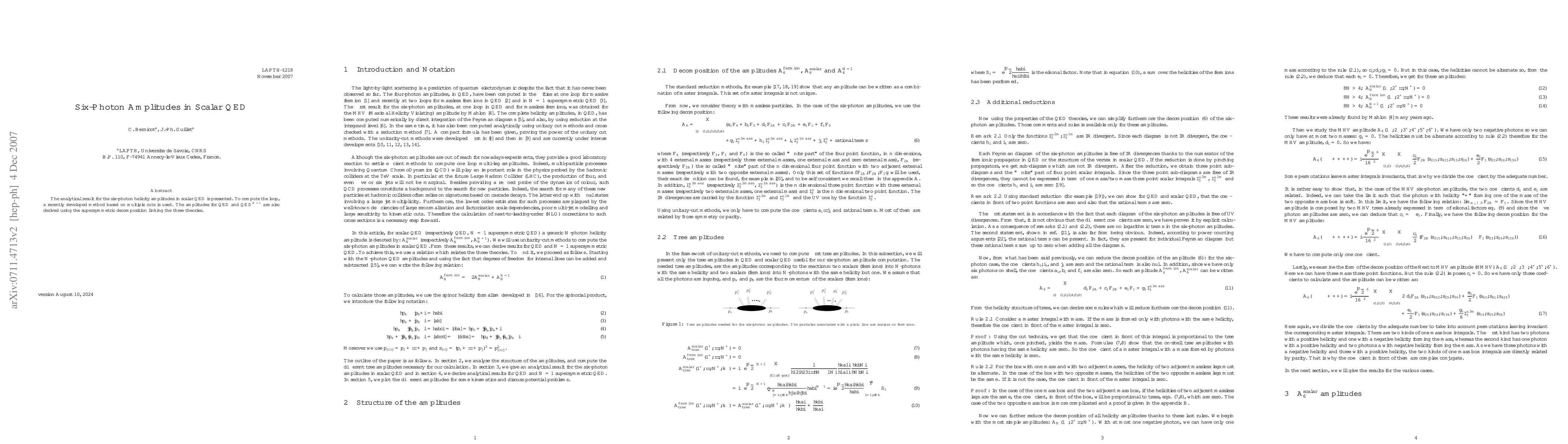 The paper presents analytical results for six-photon helicity amplitudes in scalar Quantum Electrodynamics (QED) using a method based on multiple cuts. It also derives the amplitudes for QED and its supersymmetric extension using a decomposition linking the three theories.