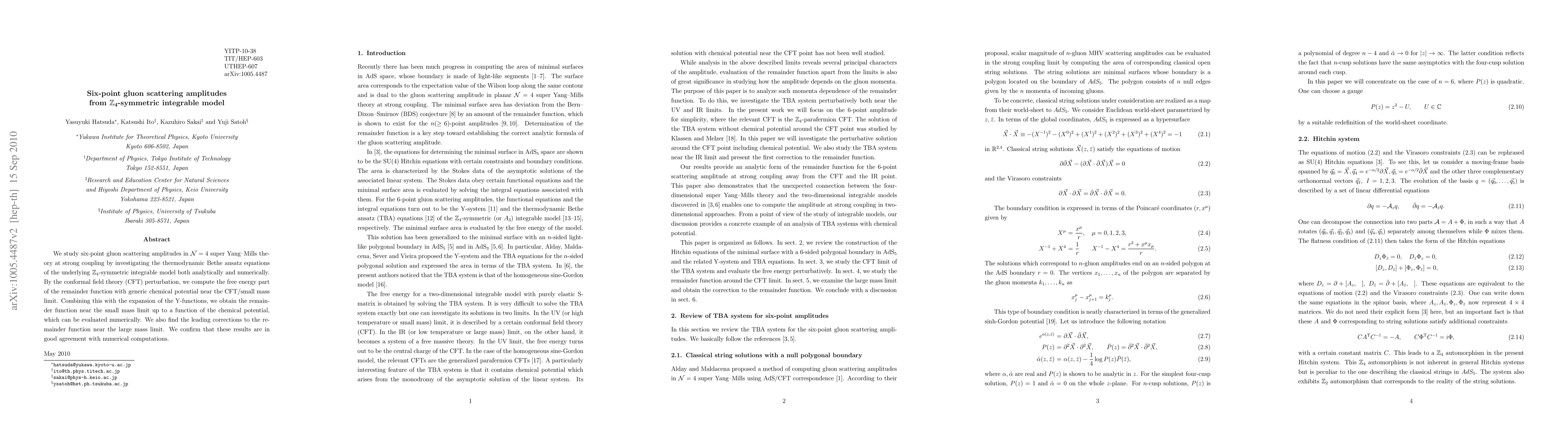 This paper investigates six-point gluon scattering amplitudes in N=4 super Yang-Mills theory using the thermodynamic Bethe ansatz of a Z_4-symmetric integrable model. Analytical and numerical methods are employed to compute the remainder function's free energy part and leading corrections, confirming results with numerical computations.