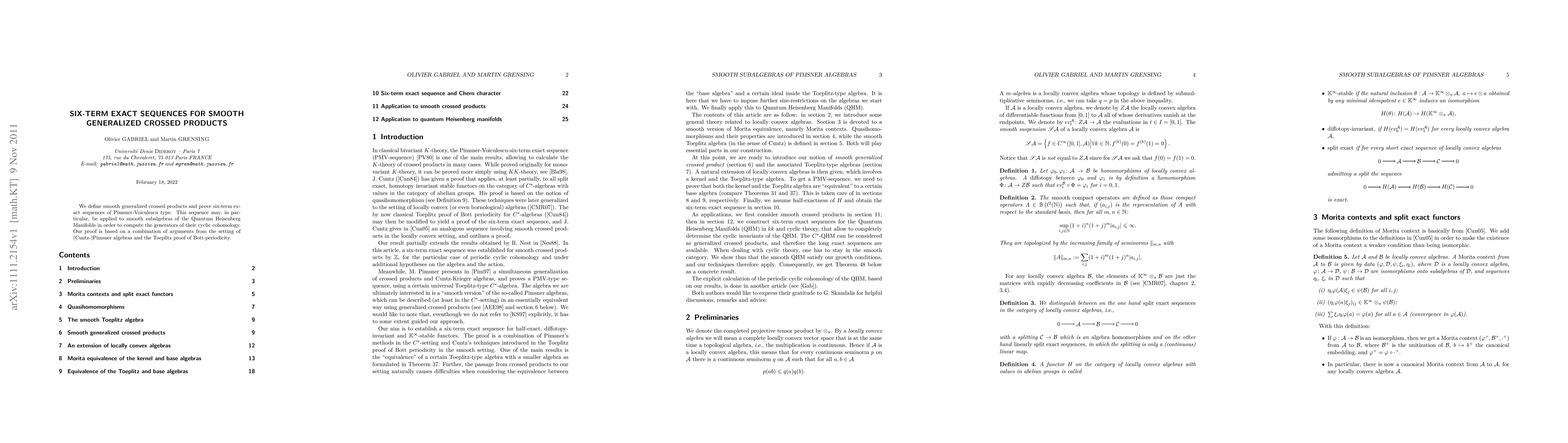 This paper defines smooth generalized crossed products and establishes six-term exact sequences of Pimsner-Voiculescu type, which are applicable to smooth subalgebras of Quantum Heisenberg Manifolds for computing cyclic cohomology. The proof integrates techniques from Cuntz-Pimsner algebras and Toeplitz's Bott-periodicity method.
