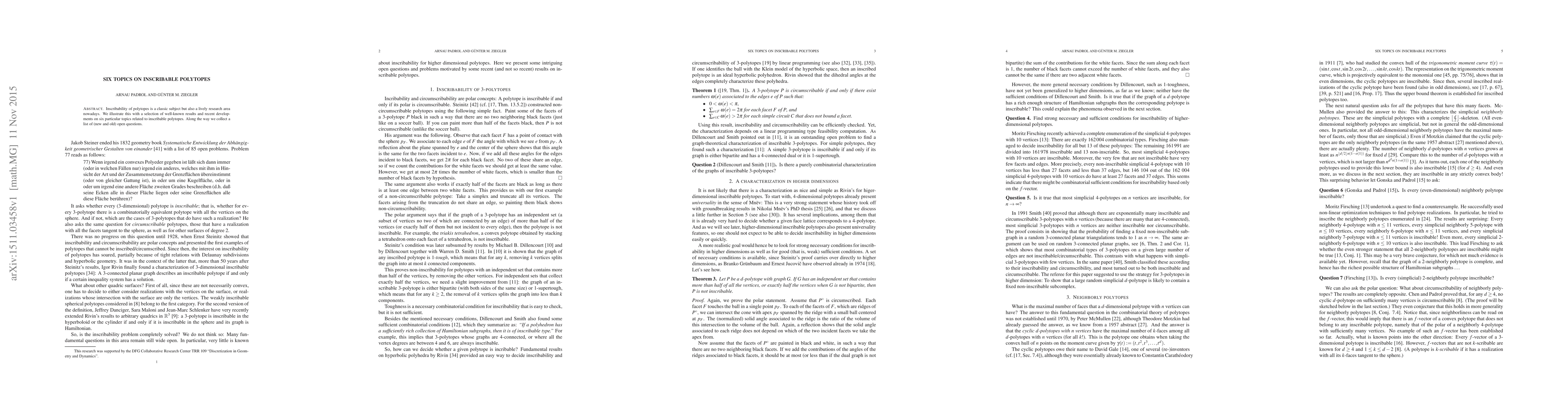 This paper reviews six topics in the study of inscribable polytopes, highlighting both classical results and recent advancements, and compiles a list of both new and existing open questions in the field.