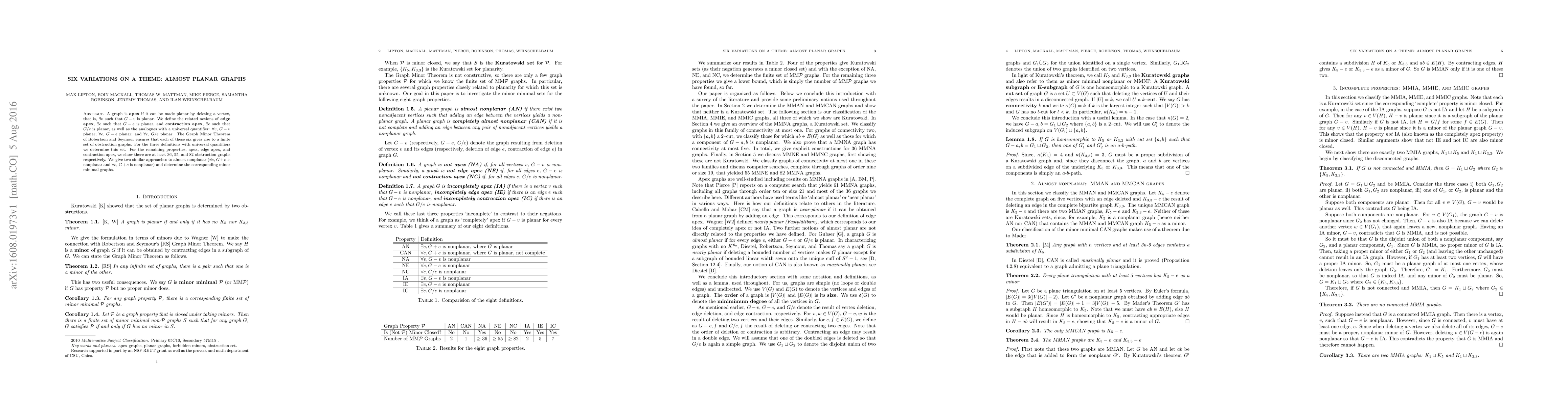 Research identifies six variations of planar graphs with obstruction graphs for certain properties, including apex, edge apex, contraction apex, and non-planarity conditions.