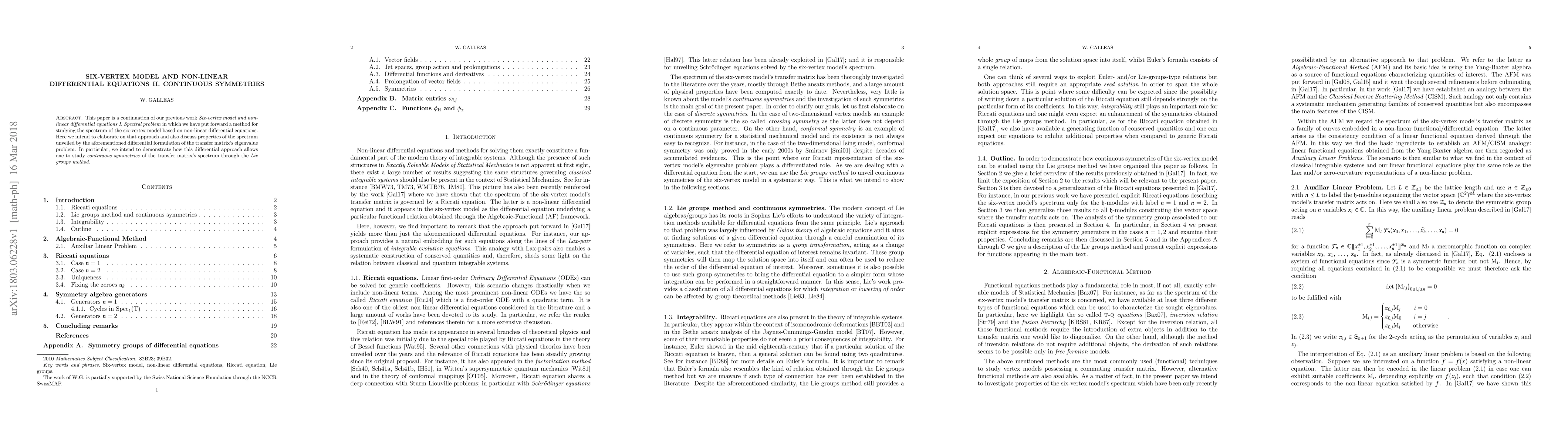 This paper is a continuation of our previous work "Six-vertex model and non-linear differential equations I. Spectral problem" in which we have put forward a method for studying the spectrum of the six-vertex model based on non-linear differential equations. Here we intend to elaborate on that approach and also discuss properties of the spectrum unveiled by the aforementioned differential formulation of the transfer matrix's eigenvalue problem. In particular, we intend to demonstrate how this differential approach allows one to study continuous symmetries of the transfer matrix's spectrum through the Lie groups method.