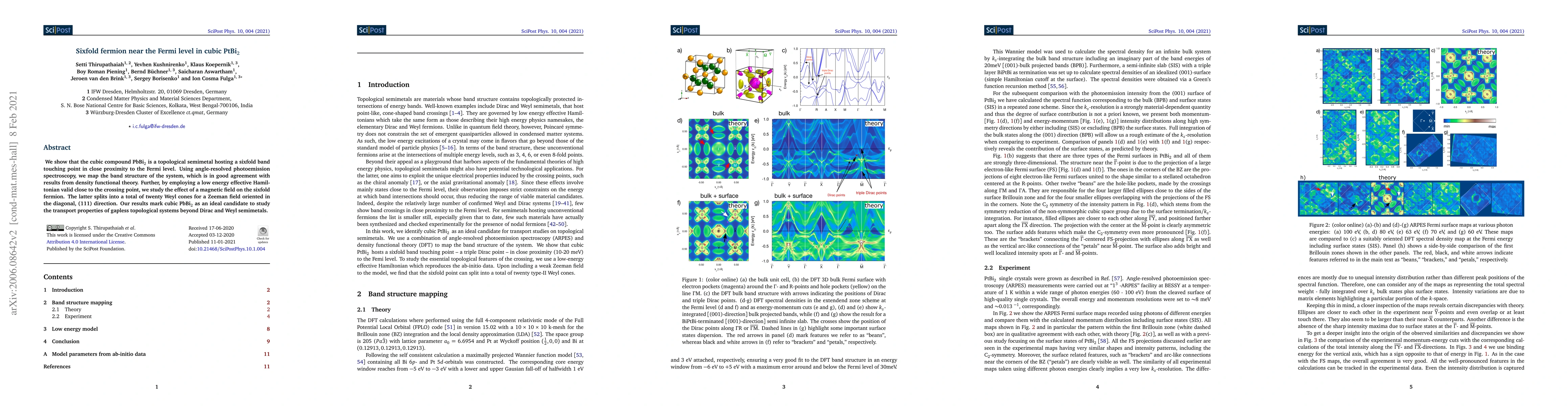 We show that the cubic compound PtBi2, is a topological semimetal hosting a sixfold band touching point in close proximity to the Fermi level. Using angle-resolved photoemission spectroscopy, we map the bandstructure of the system, which is in good agreement with results from density functional theory. Further, by employing a low energy effective Hamiltonian valid close to the crossing point, we study the effect of a magnetic field on the sixfold fermion. The latter splits into a total of twenty Weyl cones for a Zeeman field oriented in the diagonal, [111] direction. Our results mark cubic PtBi2, as an ideal candidate to study the transport properties of gapless topological systems beyond Dirac and Weyl semimetals.