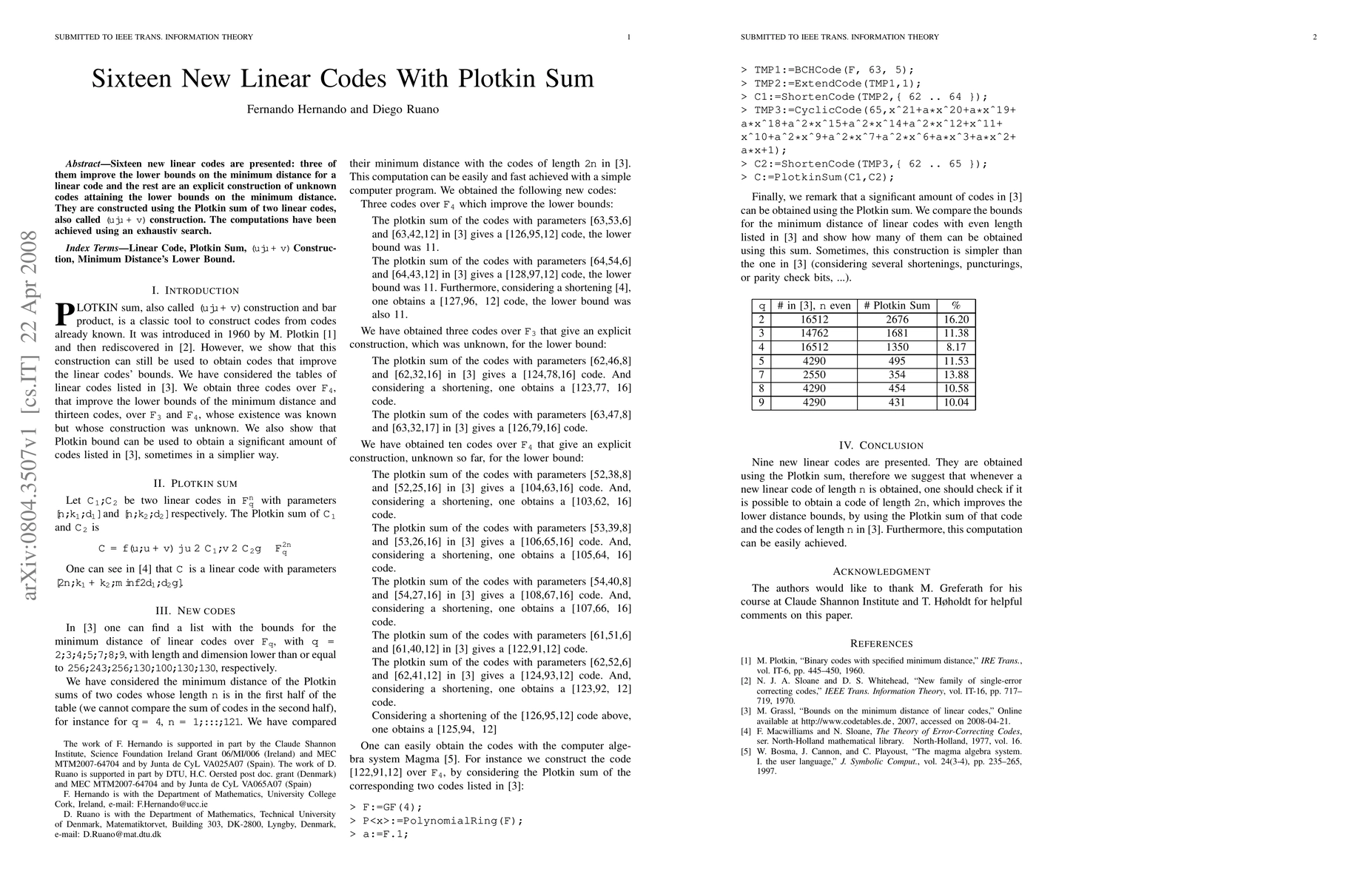 Sixteen new linear codes are presented: three of them improve the lower bounds on the minimum distance for a linear code and the rest are an explicit construction of unknown codes attaining the lower bounds on the minimum distance. They are constructed using the Plotkin sum of two linear codes, also called $(u|u+v)$ construction. The computations have been achieved using an exhaustiv search.