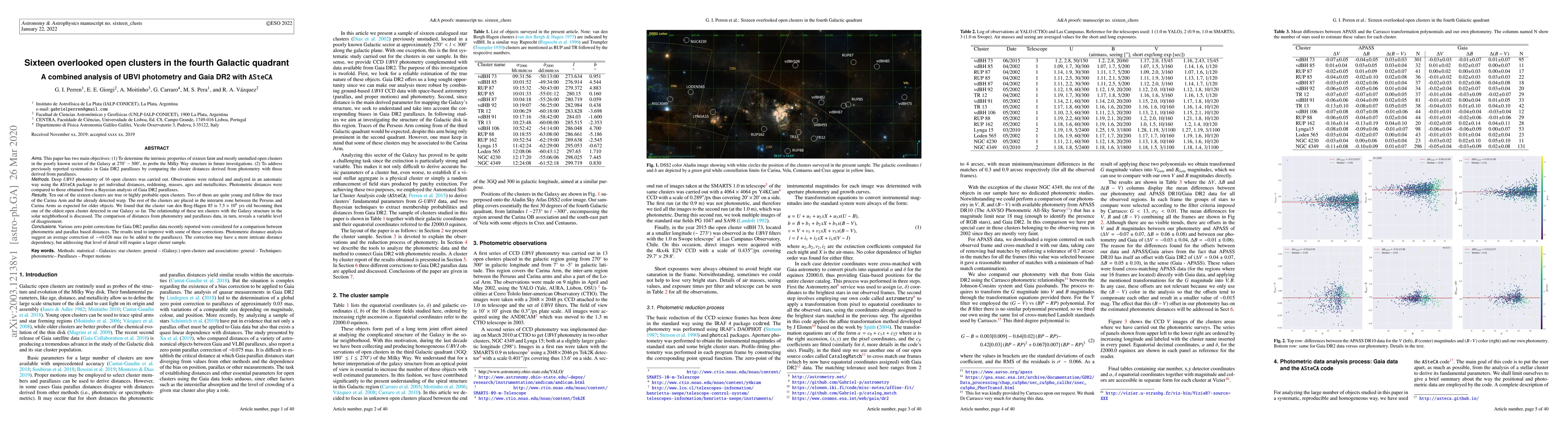 Aims: This paper has two main objectives: (1) To determine the intrinsic properties of 16 faint and mostly unstudied open clusters in the poorly known sector of the Galaxy at 270$^\circ-$300$^\circ$, to probe the Milky Way structure in future investigations. (2) To address previously reported systematics in Gaia DR2 parallaxes by comparing the cluster distances derived from photometry with those derived from parallaxes. Methods: Deep UBVI photometry of 16 open clusters was carried out. Observations were reduced and analyzed in an automaticway using the ASteCA package to get individual distances, reddening, masses, ages and metallicities. Photometric distances were compared to those obtained from a Bayesian analysis of Gaia DR2 parallaxes. Results: Ten out of the 16 clusters are true or highly probable open clusters. Two of them are quite young and follow the trace of the Carina Arm and the already detected warp. The rest of the clusters are placed in the interarm zone between the Perseus and Carina Arms as expected for older objects. We found that the cluster van den Berg-Hagen 85 is 7.5$\times$10$^9$ yrs old becoming then one of the oldest open cluster detected in our Galaxy so far. The relationship of these ten clusters with the Galaxy structure in the solar neighborhood is discussed. The comparison of distances from photometry and parallaxes data, in turn, reveals a variable level of disagreement. Conclusions: Various zero point corrections for Gaia DR2 parallax data recently reported were considered for a comparison between photometric and parallax based distances. The results tend to improve with some of these corrections. Photometric distance analysis suggest an average correction of $\sim$+0.026 mas (to be added to the parallaxes). The correction may have a more intricate distance dependency, but addressing that level of detail will require a larger cluster sample.