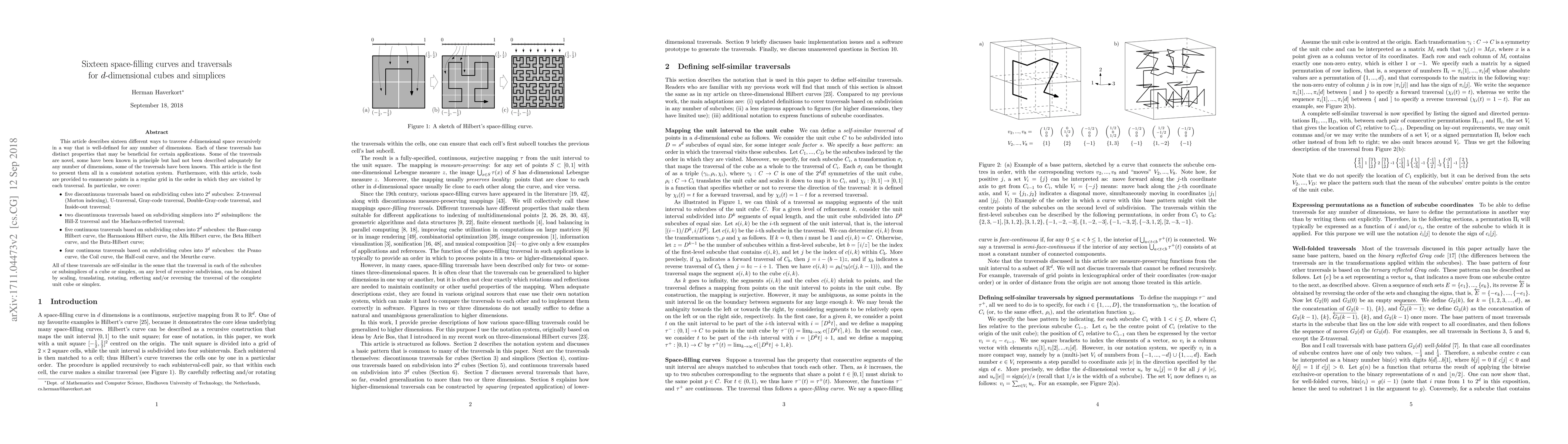 This article describes sixteen different ways to traverse d-dimensional space recursively in a way that is well-defined for any number of dimensions. Each of these traversals has distinct properties that may be beneficial for certain applications. Some of the traversals are novel, some have been known in principle but had not been described adequately for any number of dimensions, some of the traversals have been known. This article is the first to present them all in a consistent notation system. Furthermore, with this article, tools are provided to enumerate points in a regular grid in the order in which they are visited by each traversal. In particular, we cover: five discontinuous traversals based on subdividing cubes into 2^d subcubes: Z-traversal (Morton indexing), U-traversal, Gray-code traversal, Double-Gray-code traversal, and Inside-out traversal; two discontinuous traversals based on subdividing simplices into 2^d subsimplices: the Hill-Z traversal and the Maehara-reflected traversal; five continuous traversals based on subdividing cubes into 2^d subcubes: the Base-camp Hilbert curve, the Harmonious Hilbert curve, the Alfa Hilbert curve, the Beta Hilbert curve, and the Butz-Hilbert curve; four continuous traversals based on subdividing cubes into 3^d subcubes: the Peano curve, the Coil curve, the Half-coil curve, and the Meurthe curve. All of these traversals are self-similar in the sense that the traversal in each of the subcubes or subsimplices of a cube or simplex, on any level of recursive subdivision, can be obtained by scaling, translating, rotating, reflecting and/or reversing the traversal of the complete unit cube or simplex.