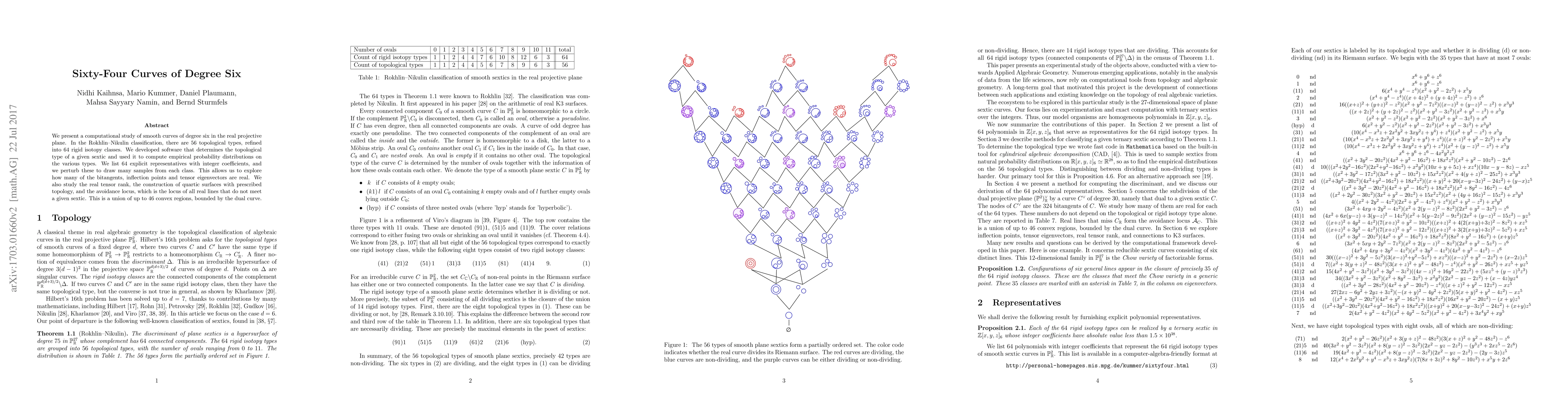 Researchers studied 64 different types of curves with six degrees in a mathematical model, finding that some characteristics like inflection points and lines intersecting the curve have specific probabilities of being real, and exploring connections to other areas of mathematics.