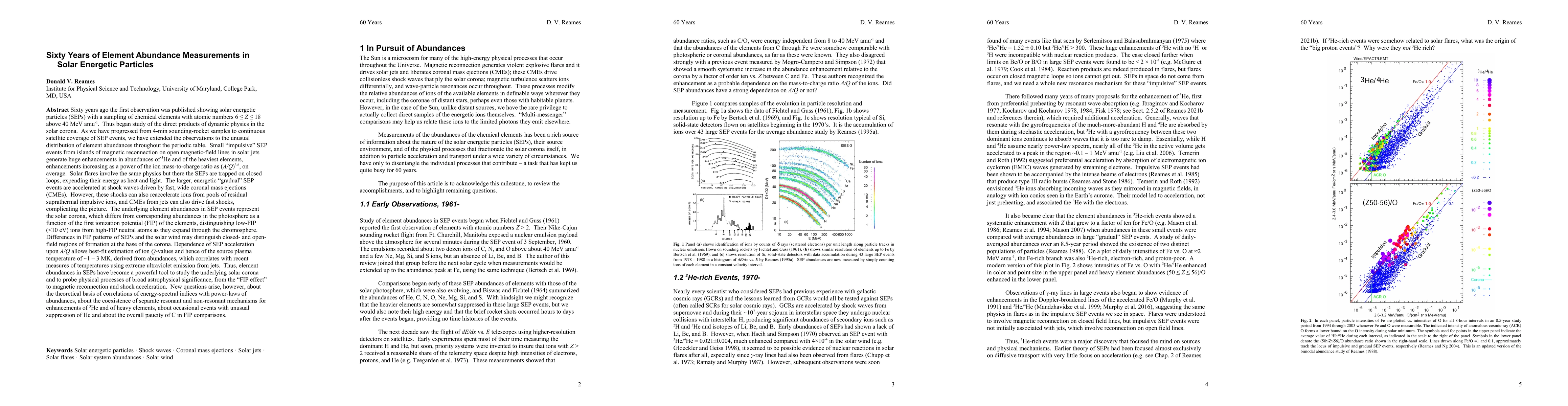 This paper reviews six decades of measurements of element abundances in solar energetic particles (SEPs), highlighting the evolution from initial rocket observations to continuous satellite monitoring. It discusses the differing mechanisms behind impulsive and gradual SEP events, and the implications of these findings for understanding the solar corona's elemental composition and the underlying physics of SEP acceleration.