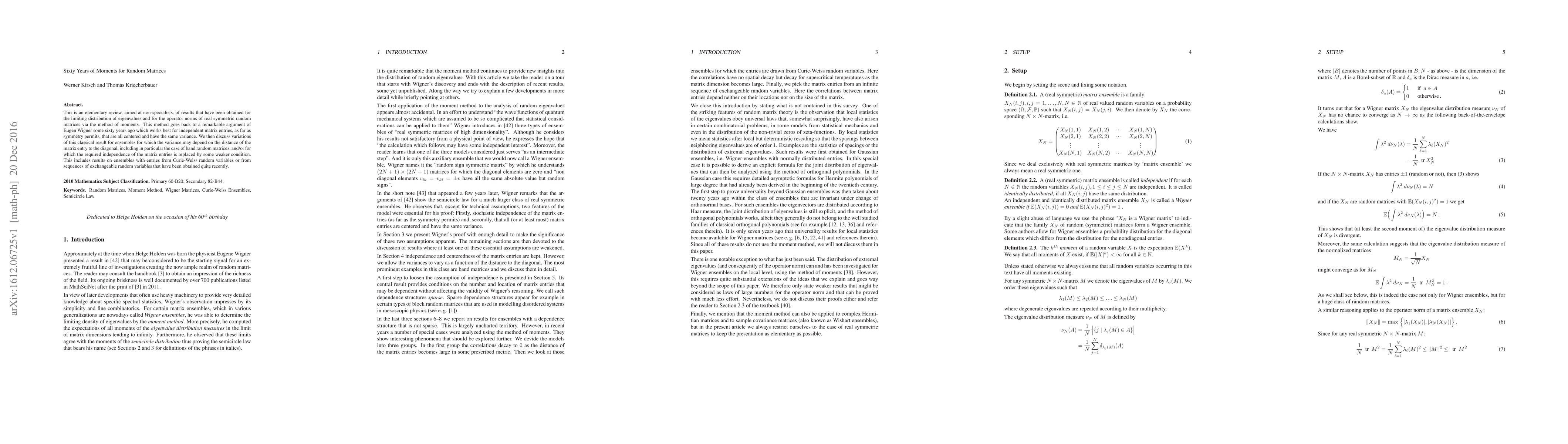 This is an elementary review, aimed at non-specialists, of results that have been obtained for the limiting distribution of eigenvalues and for the operator norms of real symmetric random matrices via the method of moments. This method goes back to a remarkable argument of Eugen Wigner some sixty years ago which works best for independent matrix entries, as far as symmetry permits, that are all centered and have the same variance. We then discuss variations of this classical result for ensembles for which the variance may depend on the distance of the matrix entry to the diagonal, including in particular the case of band random matrices, and/or for which the required independence of the matrix entries is replaced by some weaker condition. This includes results on ensembles with entries from Curie-Weiss random variables or from sequences of exchangeable random variables that have been obtained quite recently.