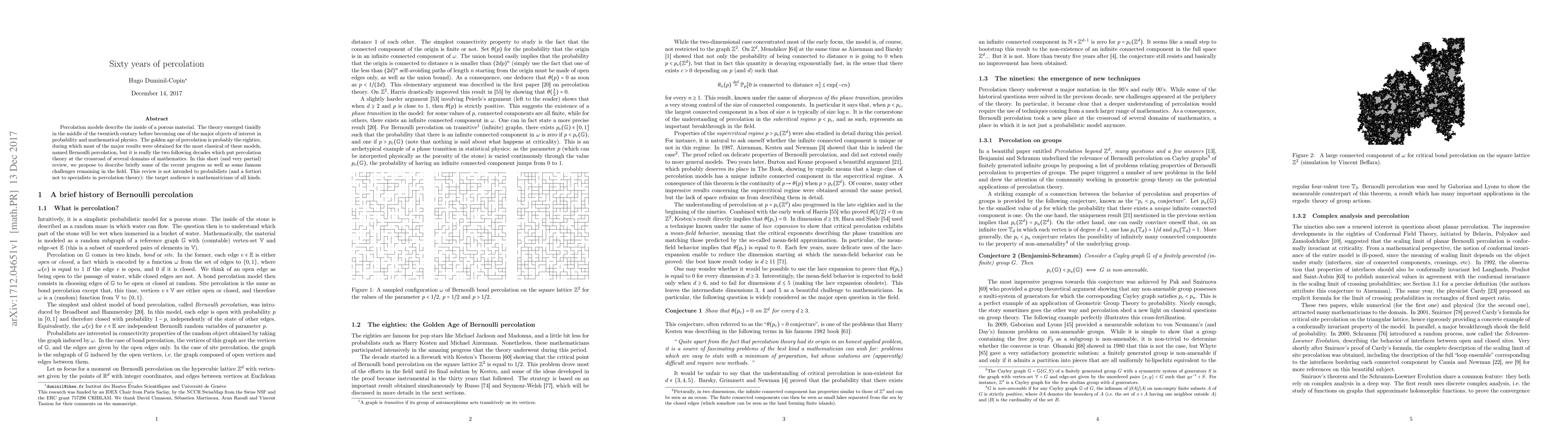 Percolation theory has made significant progress over the past 60 years, with major breakthroughs in the 1980s that have since led to its intersection with multiple domains of mathematics. The review aims to summarize recent advancements while highlighting challenges still present in the field.
