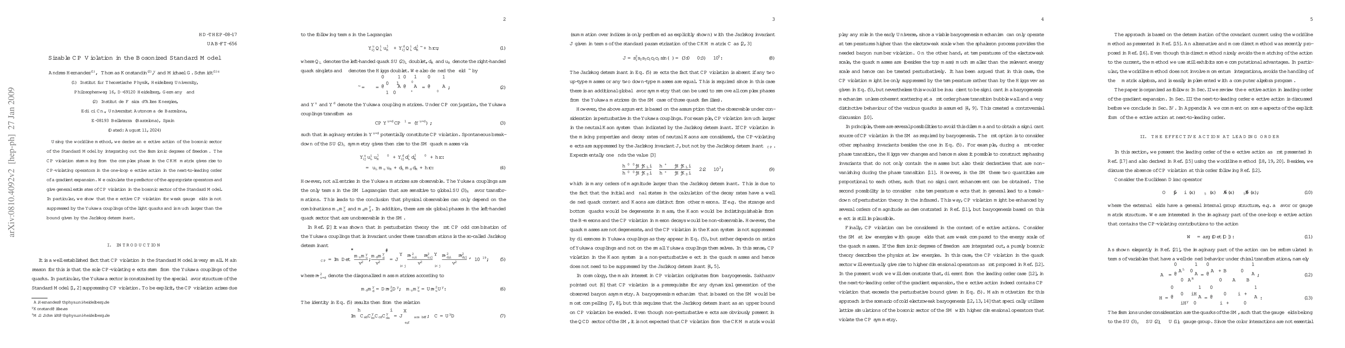 This paper derives an effective action for the bosonic sector of the Standard Model using the worldline method, revealing sizable CP violation from the complex phase in the CKM matrix. It shows that effective CP violation in the weak gauge fields is significant and not constrained by the Yukawa couplings of light quarks, exceeding typical bounds.