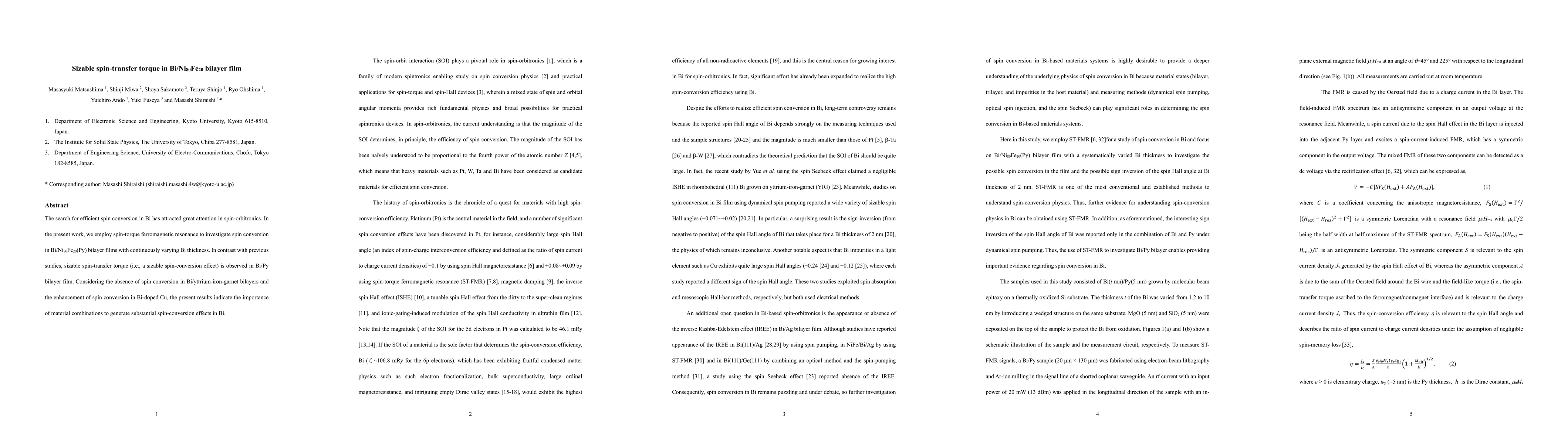 The search for efficient spin conversion in Bi has attracted great attention in spin-orbitronics. In the present work, we employ spin-torque ferromagnetic resonance to investigate spin conversion in Bi/Ni80Fe20(Py) bilayer films with continuously varying Bi thickness. In contrast with previous studies, sizable spin-transfer torque (i.e., a sizable spin-conversion effect) is observed in Bi/Py bilayer film. Considering the absence of spin conversion in Bi/yttrium-iron-garnet bilayers and the enhancement of spin conversion in Bi-doped Cu, the present results indicate the importance of material combinations to generate substantial spin-conversion effects in Bi.