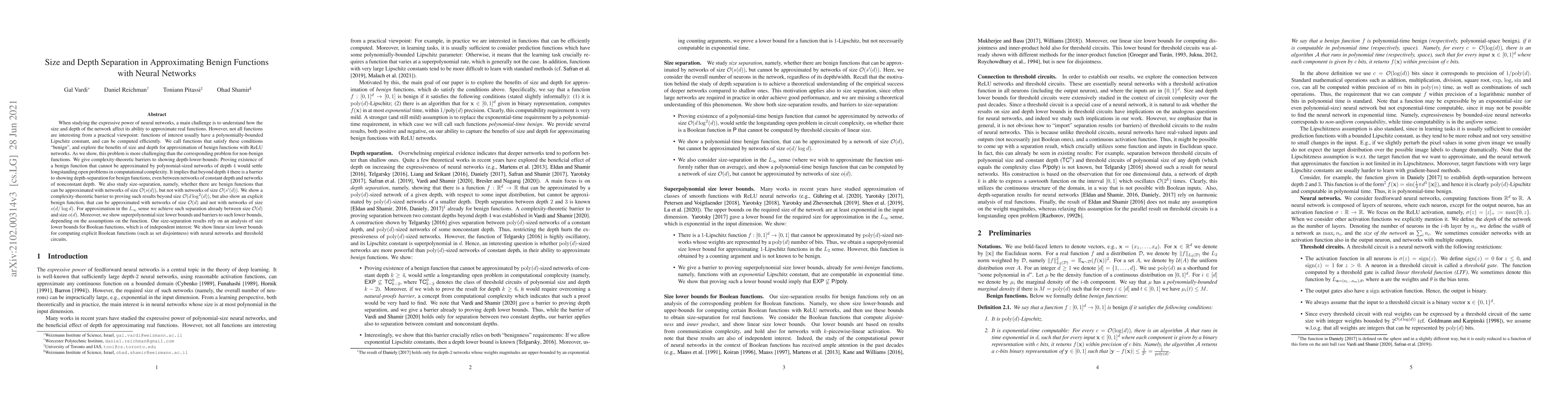 This paper investigates the expressive power of neural networks in approximating "benign" functions, which have polynomially-bounded Lipschitz constants and can be computed efficiently. It establishes complexity-theoretic barriers to proving depth-separation and size-separation for benign functions, showing that beyond depth 4 and size $O(d\log^2(d))$, proving such separations is challenging.