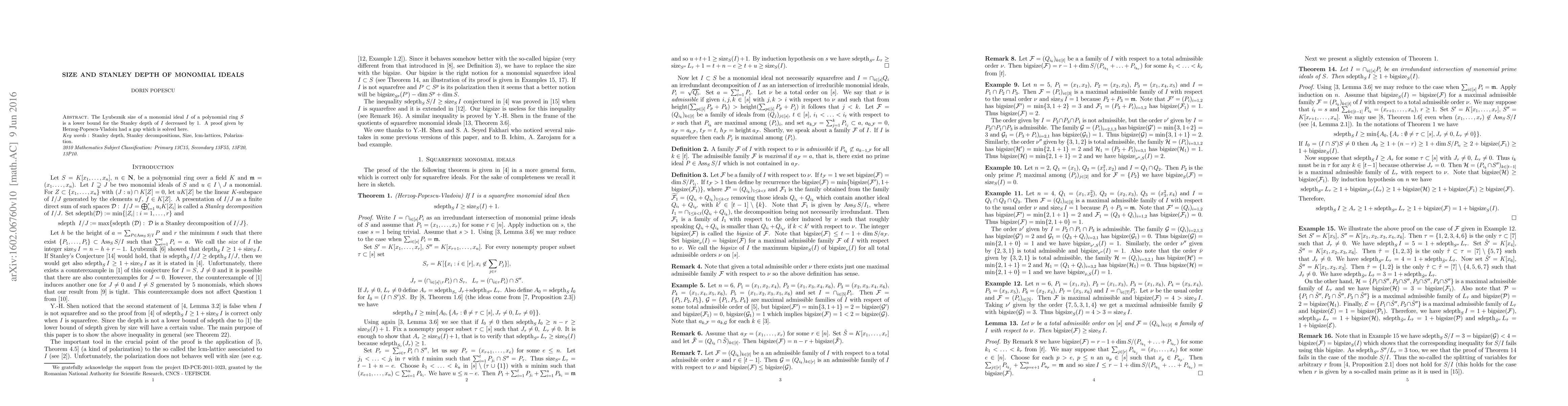 The paper provides a corrected proof for the relationship between the Lyubeznik size and Stanley depth of monomial ideals, utilizing induction and properties of admissible families.