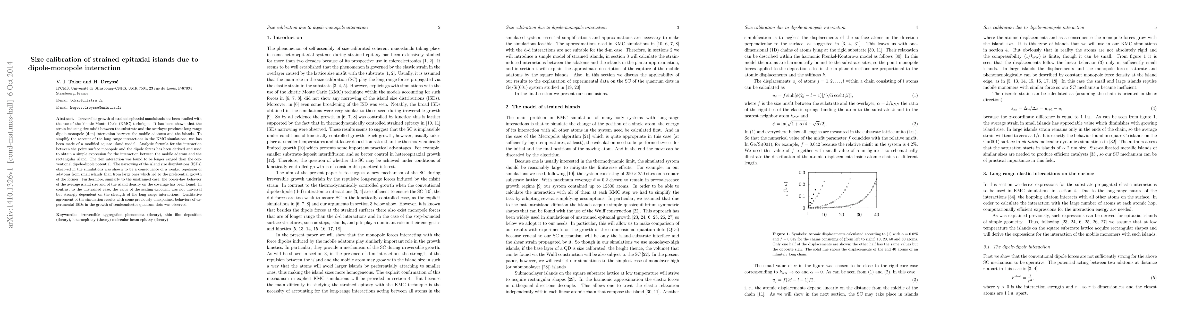 Irreversible growth of strained epitaxial nanoislands has been studied with the use of the kinetic Monte Carlo (KMC) technique. It has been shown that the strain-inducing size misfit between the substrate and the overlayer produces long range dipole-monopole (d-m) interaction between the mobile adatoms and the islands. To simplify the account of the long range interactions in the KMC simulations, use has been made of a modified square island model. Analytic formula for the interaction between the point surface monopole and the dipole forces has been derived and used to obtain a simple expression for the interaction between the mobile adatom and the rectangular island. The d-m interaction was found to be longer ranged than the conventional dipole-dipole potential. The narrowing of the island size distributions (ISDs) observed in the simulations was shown to be a consequence of a weaker repulsion of adatoms from small islands than from large ones which led to the preferential growth of the former. Furthermore, similarly to the unstrained case, the power-law behavior of the average island size and of the island density on the coverage has been found. In contrast to the unstrained case, the value of the scaling exponent was not universal but strongly dependent on the strength of the long range interactions. Qualitative agreement of the simulation results with some previously unexplained behaviors of experimental ISDs in the growth of semiconductor quantum dots was observed.