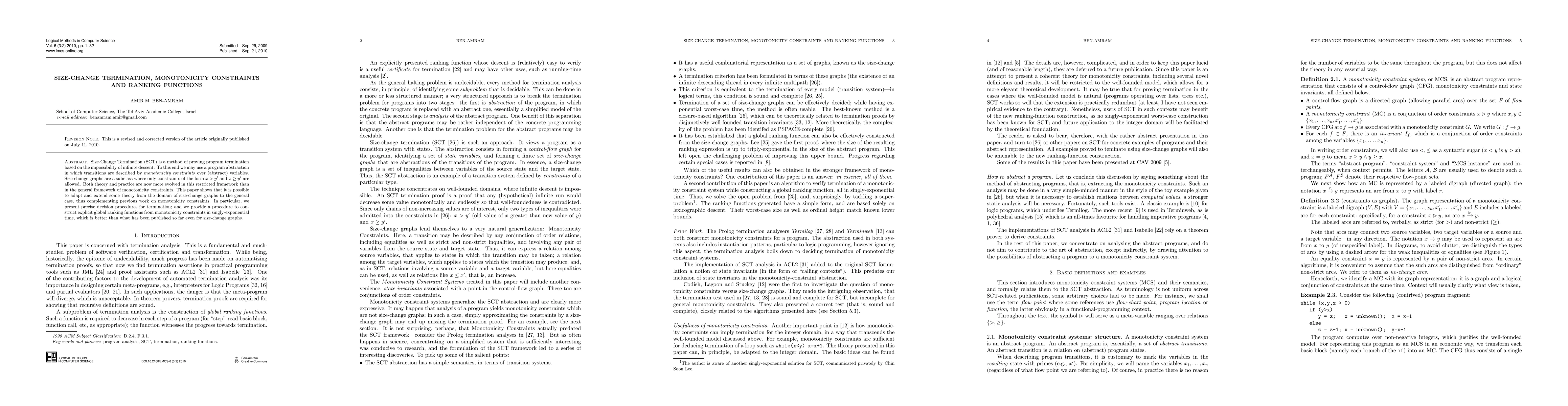This paper extends the theory of Size-Change Termination (SCT) to general monotonicity constraints, presenting decision procedures for termination and an improved algorithm for constructing global ranking functions in singly-exponential time. It complements previous work by adapting successful techniques from the restricted framework of size-change graphs to the broader context.