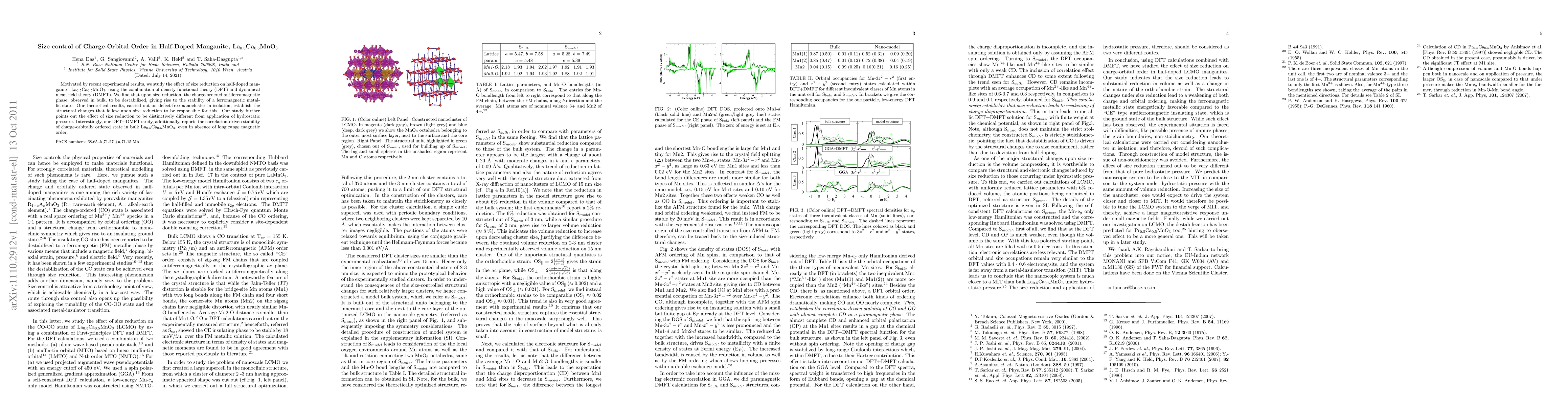 This study combines density functional theory and dynamical mean field theory to investigate how size reduction impacts the charge-orbital order in half-doped manganite La$_{0.5}$Ca$_{0.5}$MnO$_3$. The research finds that size reduction destabilizes the charge-ordered antiferromagnetic phase, leading to a ferromagnetic metallic state, highlighting structural changes as the primary cause.