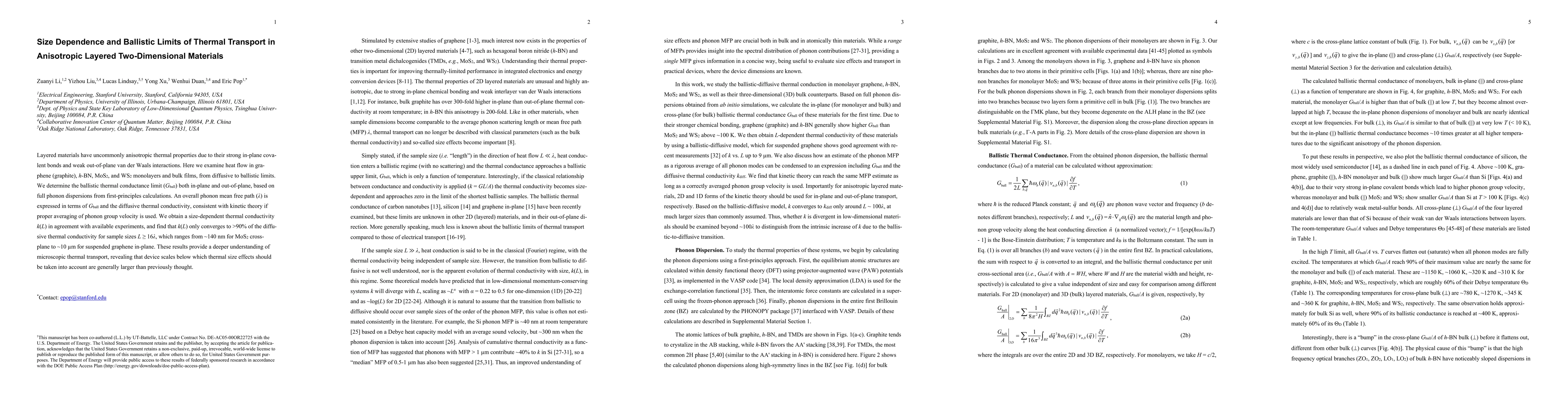 This paper investigates the thermal transport in anisotropic layered 2D materials, determining ballistic thermal conductance limits for graphene, h-BN, MoS2, and WS2. It finds that thermal conductivity converges to diffusive values only for sample sizes larger than 16 times the phonon mean free path, suggesting thermal size effects are relevant at larger scales than previously believed.